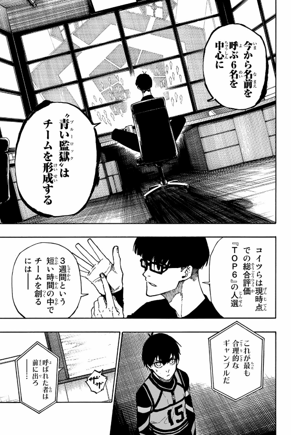 二次選考を勝ち抜き、出揃ったストライカーは35名!! ”青い監獄(ブルーロック)”の存続を懸け、総力で挑むはUー20日本代表との決戦試合!! ”青い監獄”レギュラーとして出場する11人を選ぶ、『適性試験』が幕を開ける!! TOP6 FWを超え、潔は自分を主張できるか!?