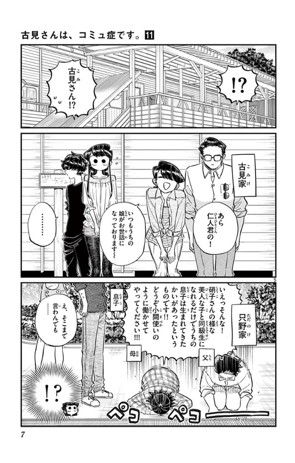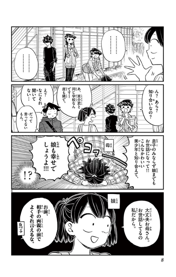 ゴールデンウィーク、古見さんは、家族旅行です。 そこには偶然、只野くんの家族となじみちゃんが。 皆で過ごせる嬉しい時間です。夜、星空を見に行こうと 只野くんと歩いていた時、突然の雨で二人は山小屋へ。 毛布は一枚、お互いが、寒くならいように譲り合い。 言葉にするのが難しかったり、照れたりする優しさが、 二人の”コミュニケーション”を紡いでいきます。