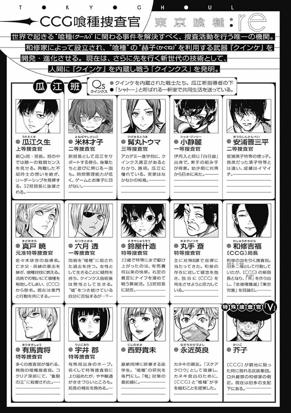 多くの犠牲を払った「あんていく」編から2年後の東京。 喰種を駆逐・研究するCCGは、ある一つの命題を果たすため、実験体集団を新設。 その名は「クインクス」。 「まともな人間」ではない彼らと、佐々木琲世一等捜査官が向き合うものとは。