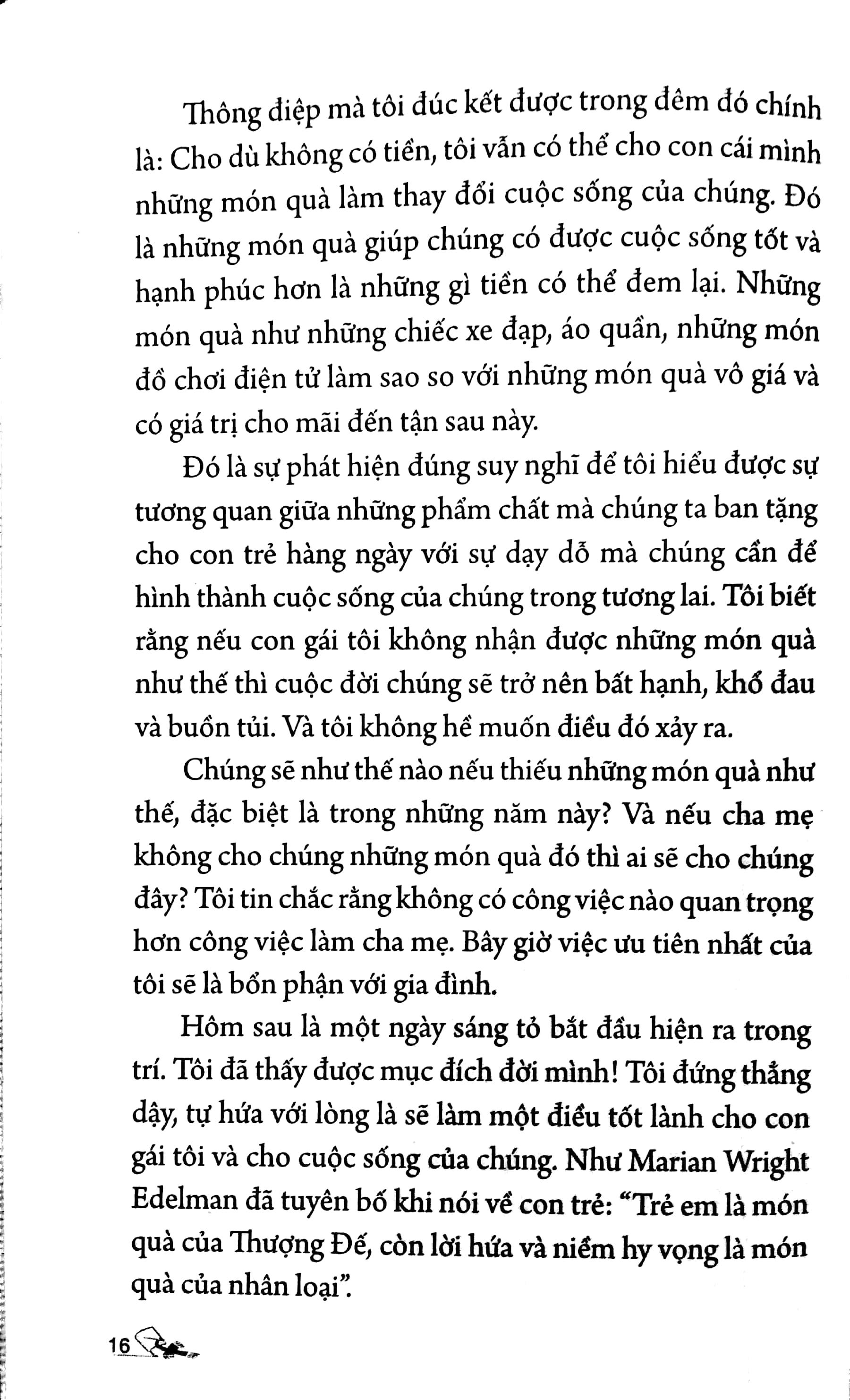 Tác giả đưa ra những phương cách đã được kiểm chứng, phổ cập, mang tính khả thi với mục đích nuôi dưỡng những giá trị nhân văn cốt lõi cho thế hệ chúng ta và con cháu. Nội dung sách sẽ mở ra cho bạn một tầm nhận thức mới nhưng rất thiết thân với gia đình, nhà trường, láng giềng hôm nay, ngày mai và những năm tháng trong tương lai. Tất cả ý nguyện và tâm niệm của tác giả được gói gọn trong sách 10 món quà vô giá đầy ý nghĩa đang chờ bạn sớm dành tặng cho con cái mình với tất cả tin yêu và hạnh phúc.