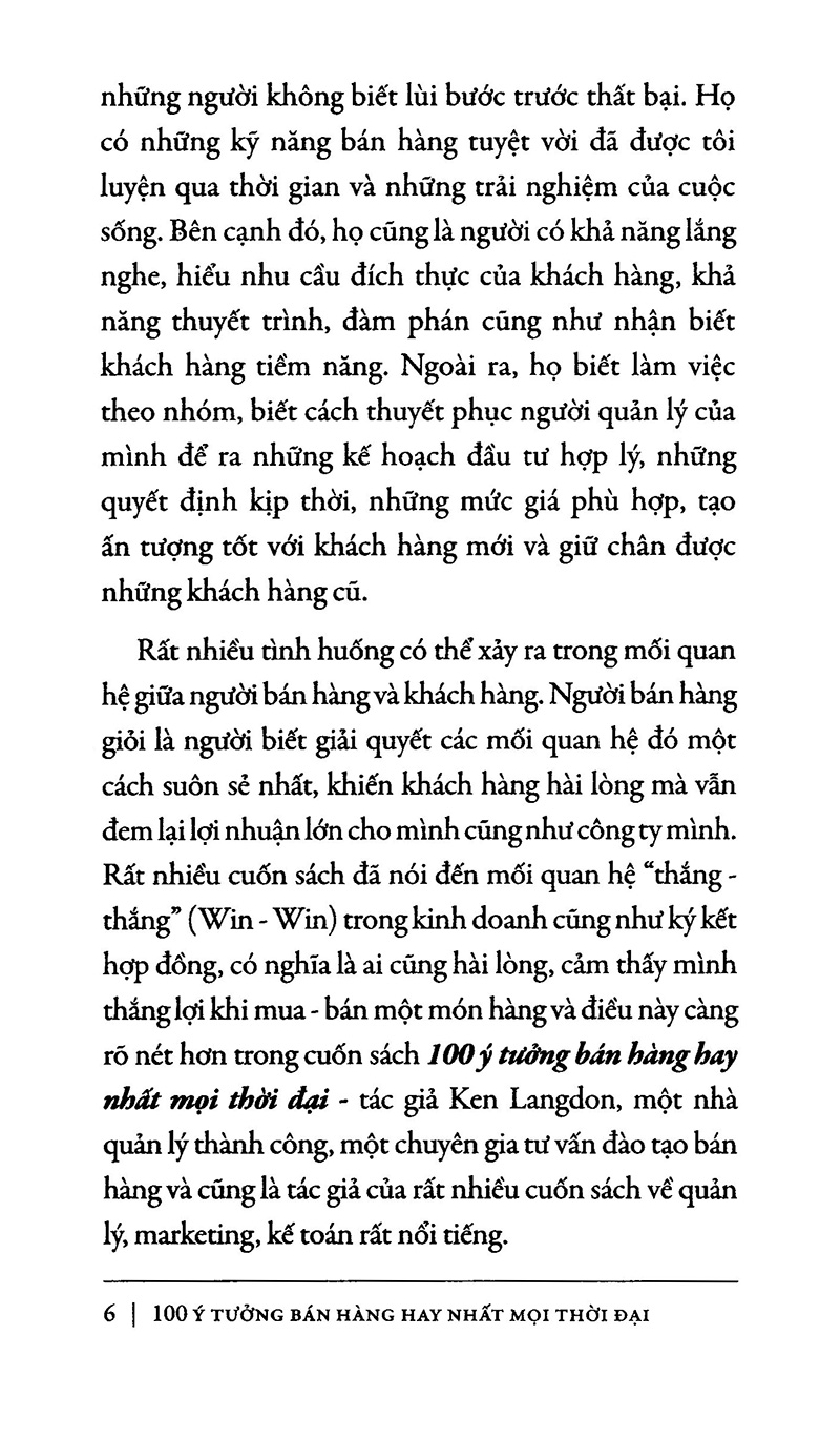 Rất nhiều tình huống có thể xảy ra trong mối quan hệ giữa người bán hàng và khách hàng. Người bán hàng giỏi là người biết giải quyết các mối quan hệ đó một cách suôn sẻ nhất, khiến khách hàng hài lòng mà vẫn đem lại lợi nhuận lớn cho mình cũng như công ty mình. Rất nhiều cuốn sách đã nói đến mối quan hệ “thắng - thắng” (Win - Win) trong kinh doanh cũng như ký kết hợp đồng, có nghĩa là ai cũng hài lòng, cảm thấy mình thắng lợi khi mua - bán một món hàng và điều này càng rõ nét hơn trong cuốn sách 100 ý tưởng bán hàng hay nhất mọi thời đại - tác giả Ken Langdon, một nhà quản lý thành công, một chuyên gia tư vấn đào tạo bán hàng và cũng là tác giả của rất nhiều cuốn sách về quản lý, marketing, kế toán rất nổi tiếng.