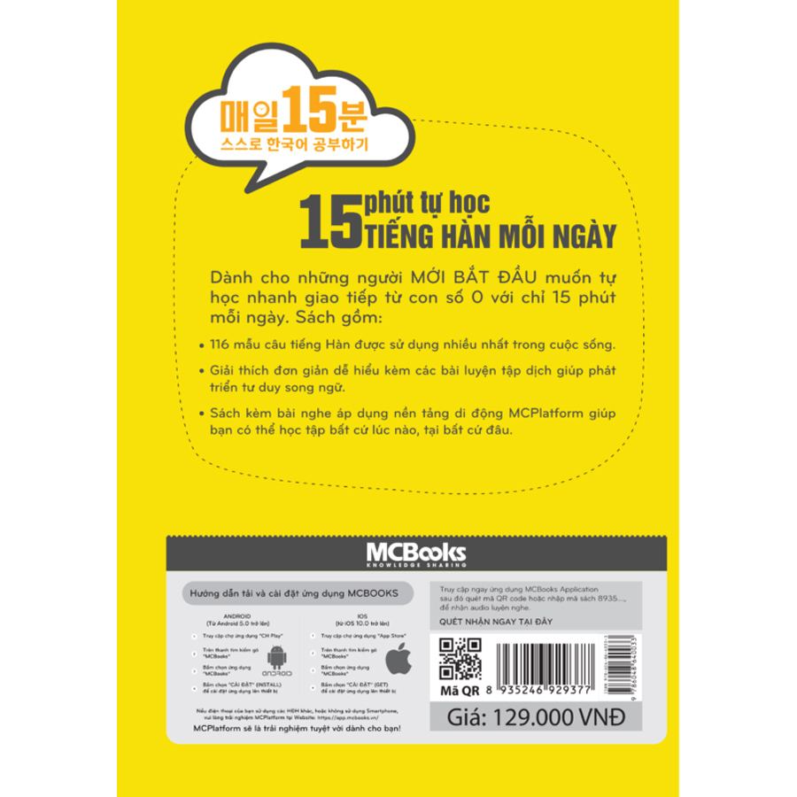 Các bài nghe đều được thực hiện bởi người có phát âm tiếng Hàn chuẩn, qua đó các bạn nâng cao được kỹ năng nghe một cách nhanh nhất. Để tiện lợi hơn trong quá trình học tập, giúp bạn tận dụng mọi khoảng thời gian trống để ôn lại các bài nghe, với “15 phút tự học tiếng Hàn mỗi ngày”, chỉ cần tải app của MCBooks và quét mã QR ở bìa sau cuốn sách là bạn đã có thể sở hữu cuốn sách ngay trong điện thoại của mình. Hệ thống hỗ trợ trên cả hai hệ điều hành Android và IOS. Hãy thưởng thức công nghệ trong một cuốn sách tuyệt vời của MCBooks. Chắc chắn cuốn sách này sẽ là bạn đồng hành không thể thiếu trên chặng đường học tiếng Hàn của bạn.