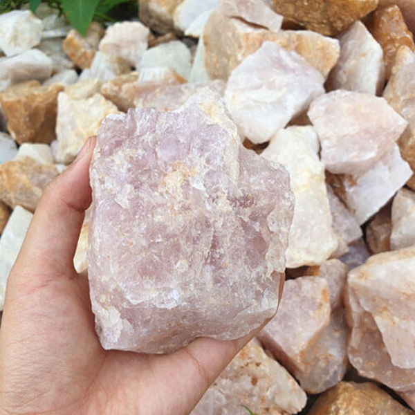 Đá thạch anh thô vụn hồng cỡ 4x6cm để rải nền trấn trạch, gia công thành cục chặn giấy, vòng đeo tay, làm vật trang trí để bàn. Có tác dụng giúp trấn trạch, tránh tà khí, cân bằng năng lượng, ổn định trường khí cho nhà của gia chủ. Nhà Sàn Tây Nguyên chuyên cung cấp đá thạch anh thô vụn hồng Việt Nam, là địa chỉ tin cậy được các chuyên gia, thầy phong thủy, thầu xây dựng tìm đến.