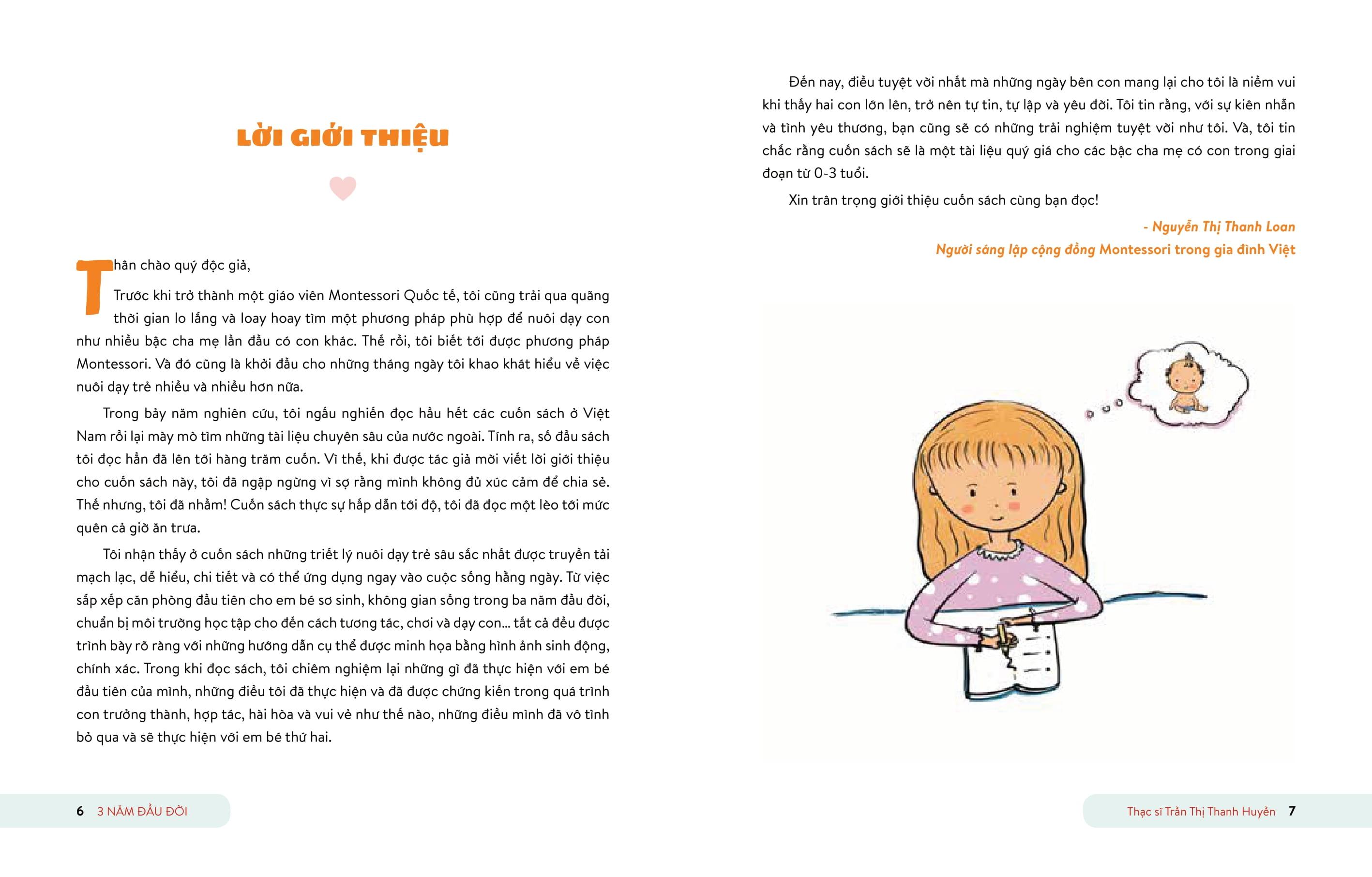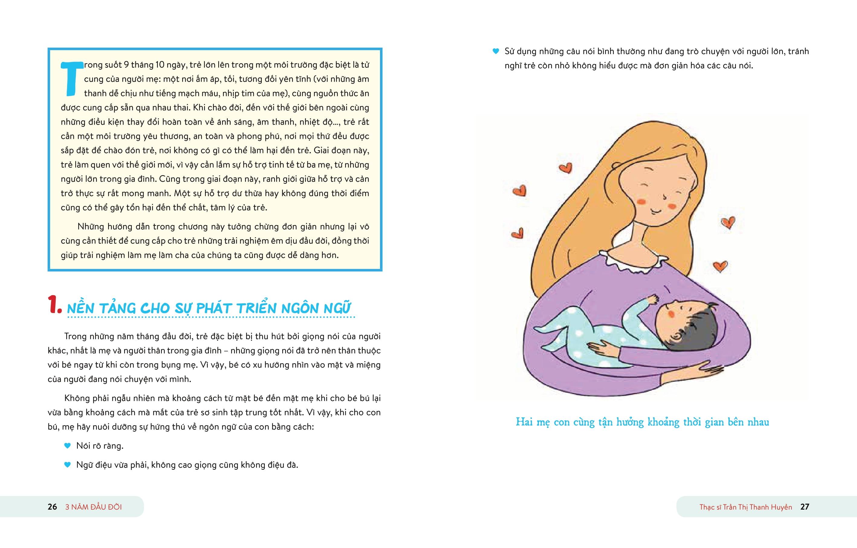 Nội dung chính: Nội dung chính được chia theo các giai đoạn: từ lúc mang thai, 0-6 tháng đầu, 6-12 tháng, 1-3 tuổi. Từng giai đoạn được xây dựng xung quanh các chủ đề cụ thể như: dinh dưỡng, giấc ngủ, vận động, sự phát triển ngôn ngữ, kỹ năng xã hội. Xuyên suốt các giai đoạn, tác giả nhấn mạnh tầm quan trọng của việc tôn trọng nhu cầu và cảm xúc ở trẻ, khuyến khích cha mẹ hãy là người bạn đồng hành thay vì áp đặt.