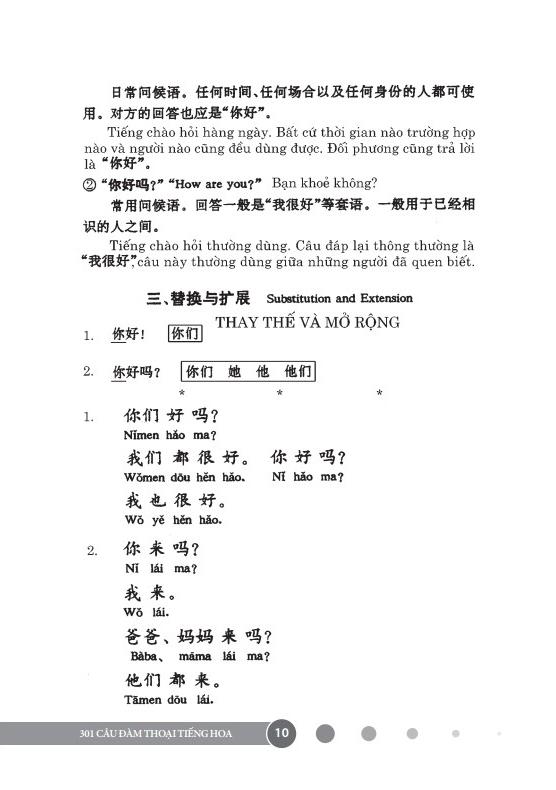 1 你好!Nǐ hǎo! Chào bạn! 2 你好吗?Nǐ hǎo ma? Bạn khỏe không? 3 你爸爸妈妈身体好吗?Nǐ bàba māma shēntǐ hǎo ma? Sức khỏe bố mẹ bạn tốt không? 4 我爸爸妈妈身体都很好。Wǒ bàba māma shēntǐ dōu hěn hǎo. Sức