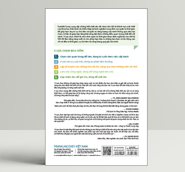 “Không ai thấu hiểu việc quản lý thời gian và năng suất hơn những nhà nghiên cứu và chuyên gia tư vấn của Franklin Covey. “5 Lựa chọn” mang đến những hiểu biết mới lạ, thú vị, và hơn tất cả là những hiểu biết sâu sắc và vô cùng thiết thực, có thể giúp bạn xử lý lượng công việc choáng ngợp và nhận ra toàn bộ tiềm năng của mình, cả trong công việc và cuộc sống”.