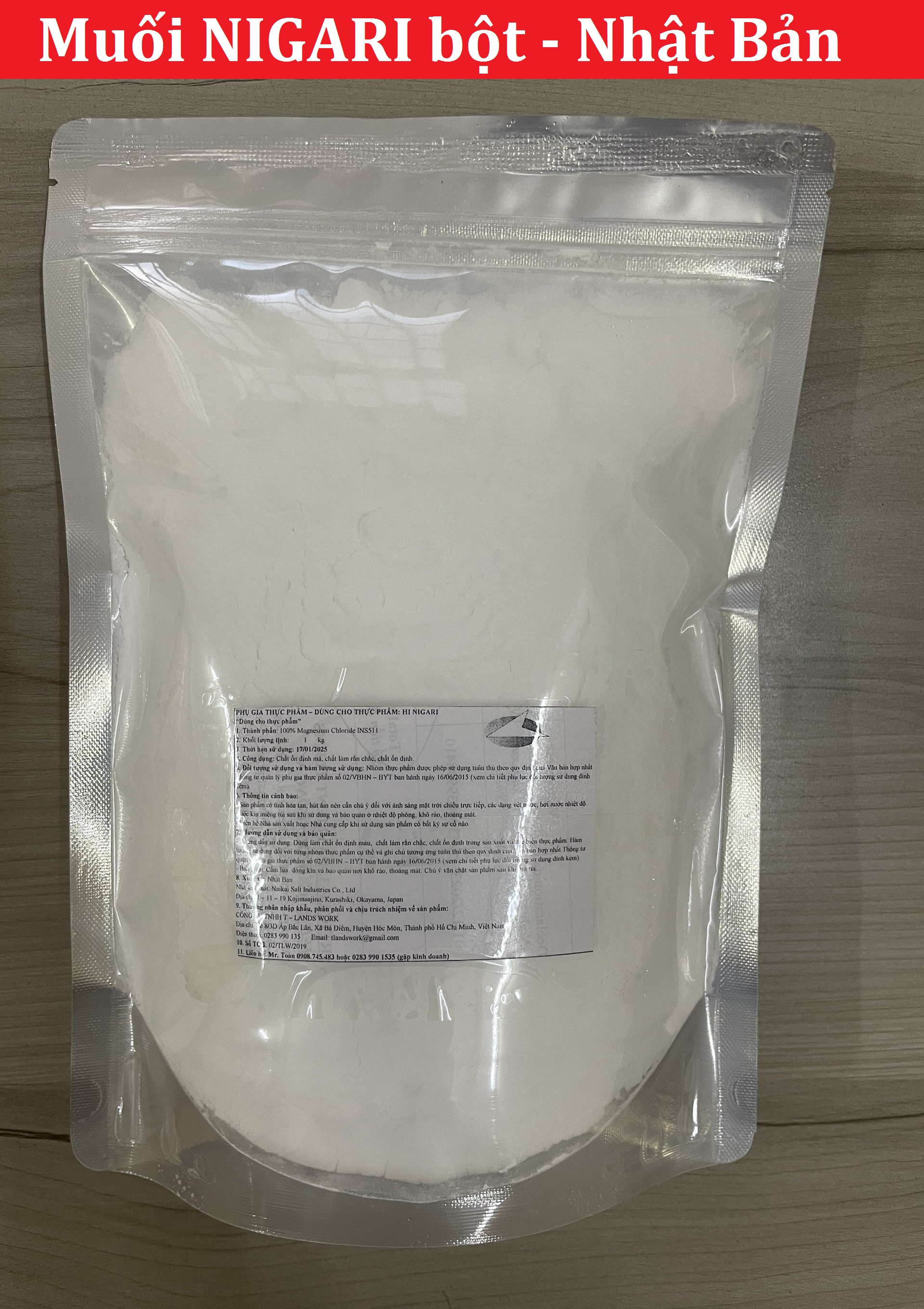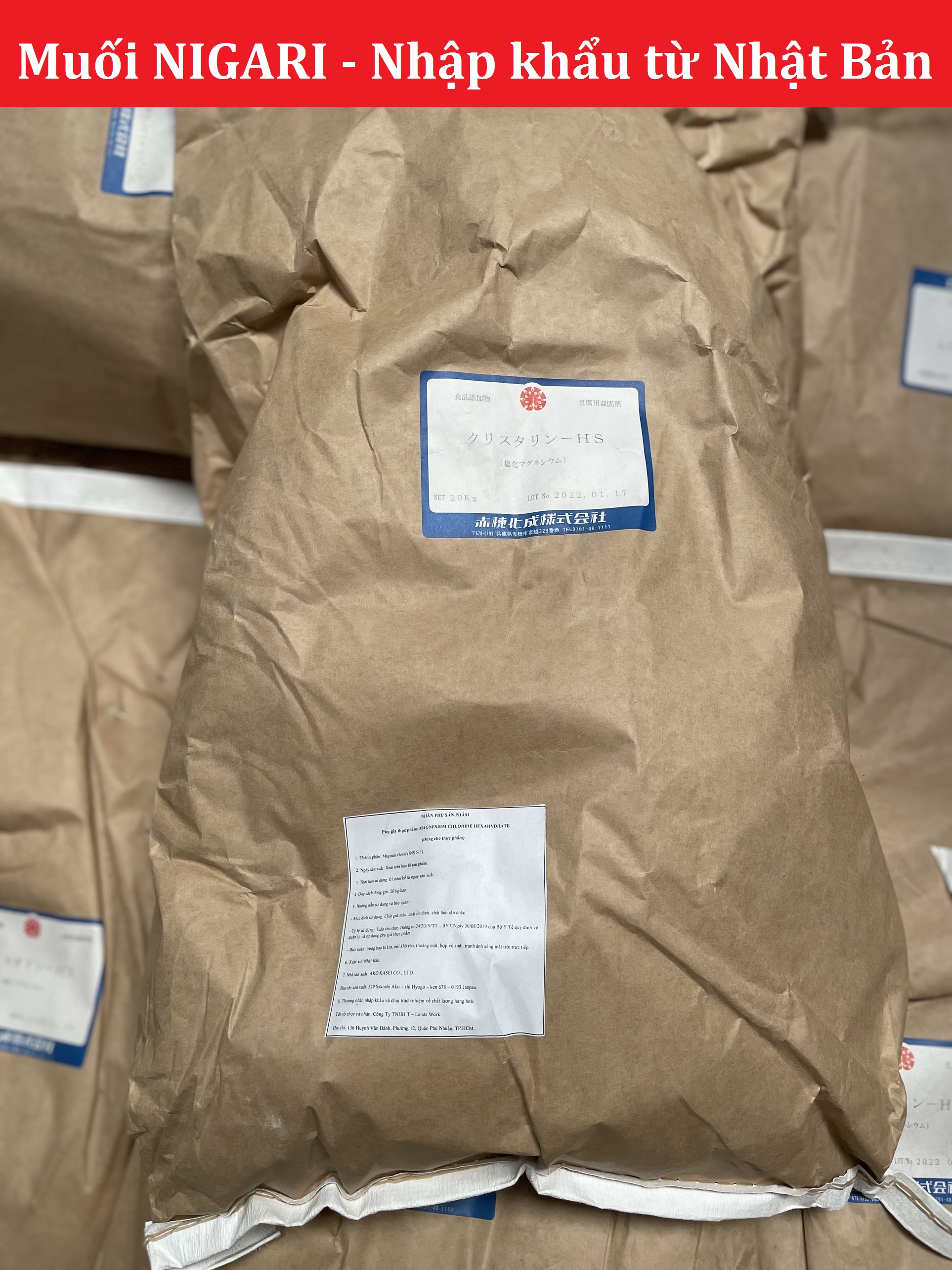 Thông tin về sản phẩm Tên thường gọi :Muối Nigari, muối Nhật, muối Nigari bột, muối làm đậu hũ Tên khoa học : MAGNESIUM CHLORIDE HEXAHYDRATE Thành phần : 100% Magnesi clorid (INS 511) Thành