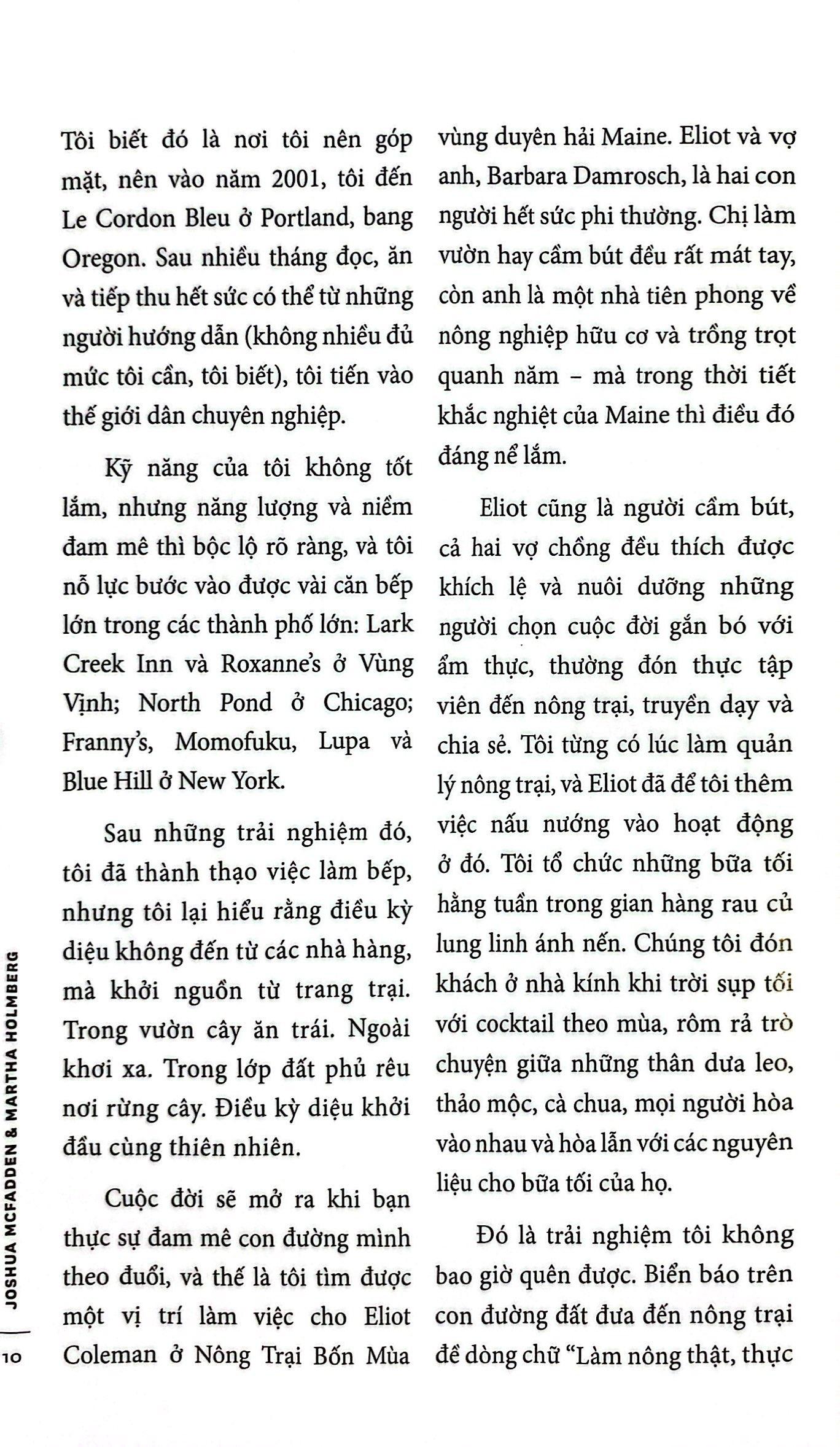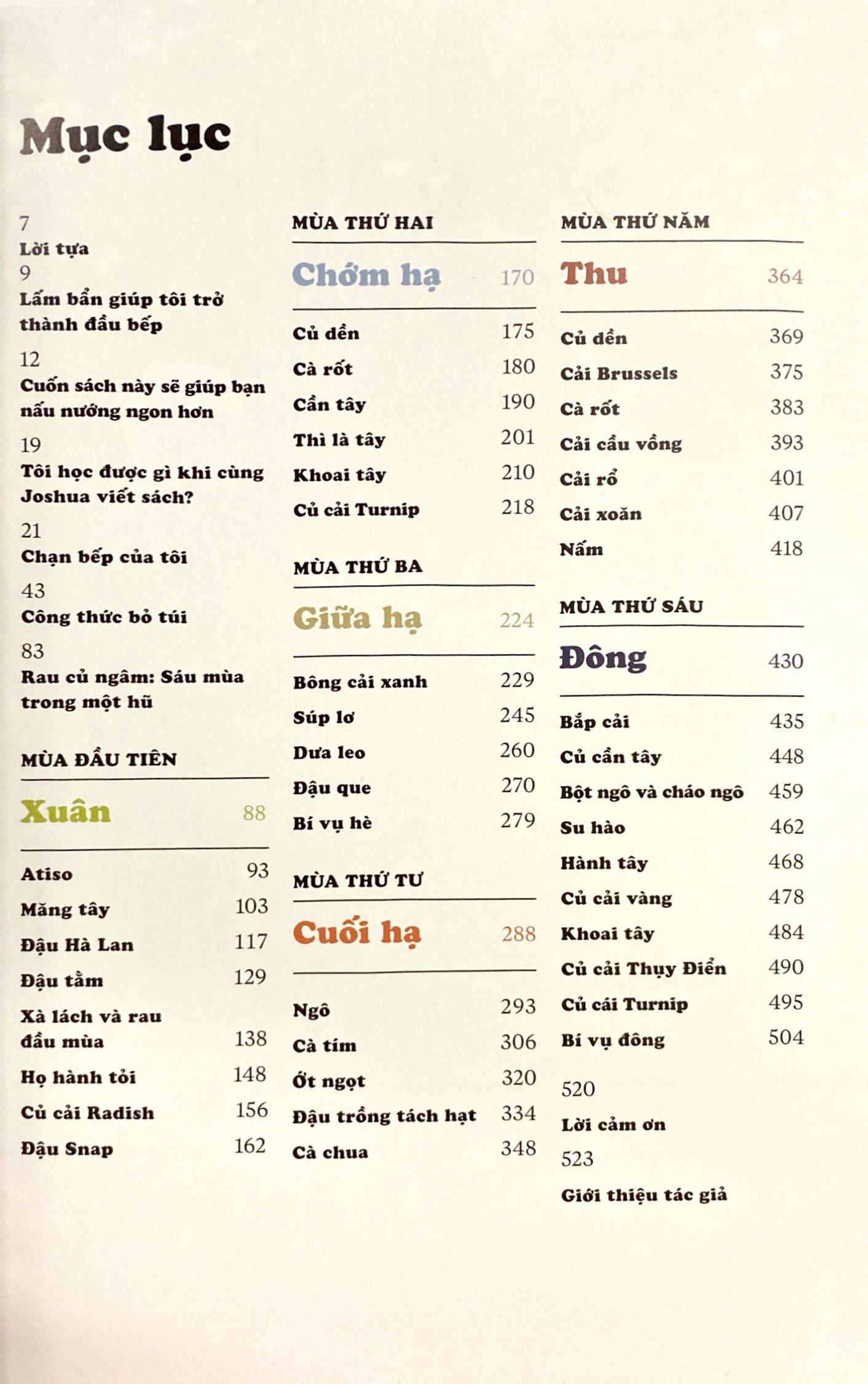 Từ căn bếp của nhà hàng nổi tiếng Blue Hill, Joshua McFadden đã tới “nghịch đất” ở Nông Trại Bốn Mùa, học cách gieo trồng, thu hoạch và chế biến thức ăn theo mùa tươi ngon thấm đẫm vị của đất trời. “Nhưng theo mùa là theo thế nào? Xuân, Hạ, Thu, Đông không đủ để thể hiện những gì thực sự diễn ra ngoài ruộng ngoài vườn, thế nên tôi phân chia cuốn sách thành 6 MÙA, thay vì bốn mùa truyền thống. Trong cuốn sách này, mùa hè được chia làm ba phần, vì mùa hè là mùa năng động, cứ cách vài tuần là cách đợt rau củ mới tới tấp đổ về, gần như một vụ mùa nhỏ.”