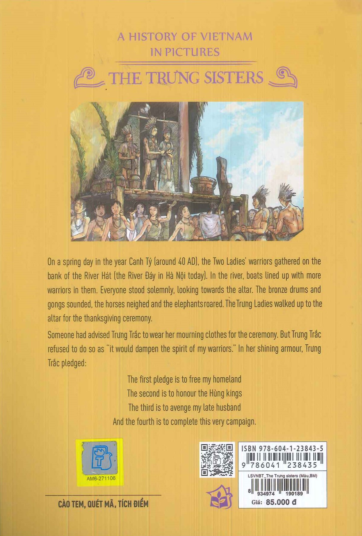 Mua tại TiktokThe series A History of Vietnam in Pictures presents the history of Vietnam in a brief, interesting and systematic way through concise tales and beautiful pictures. The Trưng Ladies were Trưng Trắc and Trưng Nhị, two best known female heroes in Việt Nam. Together with her sister, Trưng Trắc led an uprising against the Hán invaders, liberated the country and became Queen. This infuriated the Hán Emperor. He ordered Mã Viện - a notoriously cunning general to invade Việt Nam again. On the sixth day of the second month in the lunar year Quý Mão (43 AD), faced with an enemy much stronger than their own army, the ladies threw themselves into the Hát river to avoid falling into the hands of the enemy.