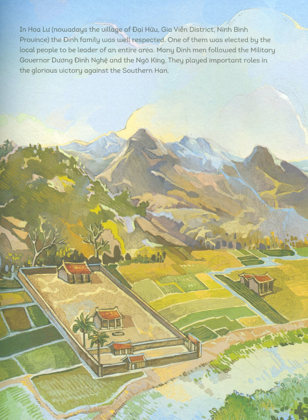 Đinh Bộ Lĩnh’s beginning was humble- a buffalo boy in the countryside. This buffalo boy grew up to be the hero who brought peace with his outstanding talent and wisdom. In the year Mậu Thìn (968), Đinh Bộ Lĩnh became Emperor. His title was Đại Thắng Minh Hoàng Đế (The Great Glorious Victorious Emperor). He gave the country the name Đại Cồ Việt and chose Hoa Lư to be the capital. With this he laid down the foundation for an independent and unified Việt Nam in relation to her neighbour China.