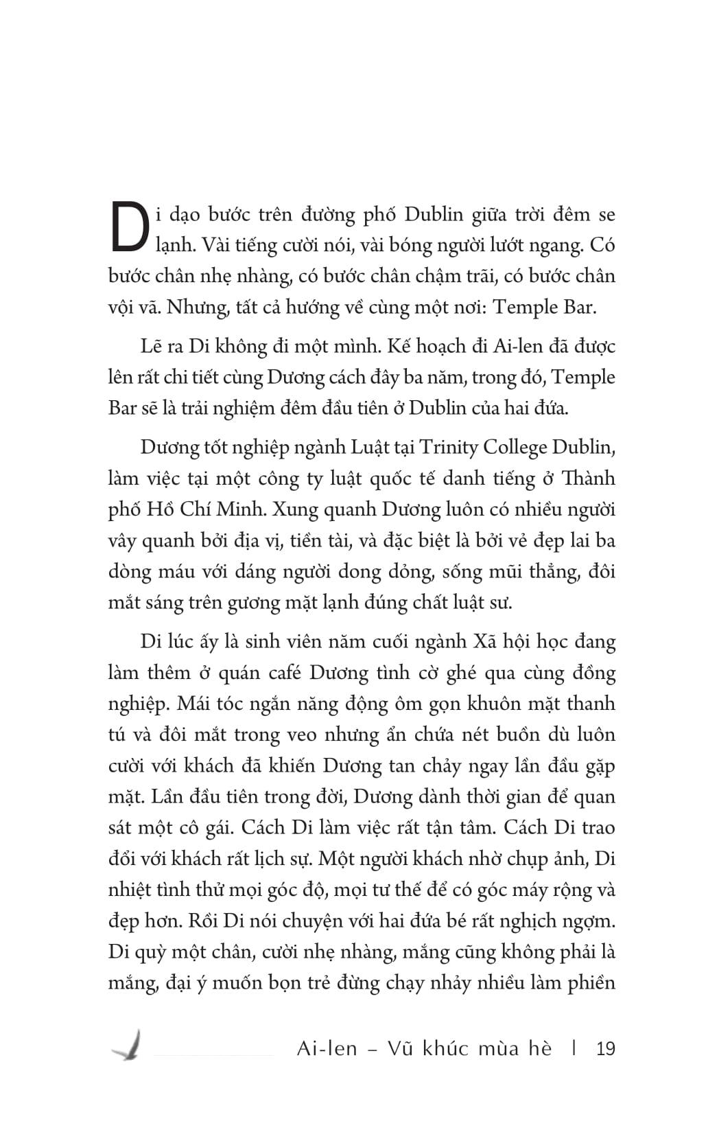 Để du khách có hai giờ tự do khám phá, Liam leo lên ngọn đồi, lướt mắt nhìn cảnh vật xung quanh và hướng ra hồ Glendalough. Đôi mắt anh bị hút bởi dáng ngồi cô đơn của Di ở ven hồ. Từ ngày quen Fiona, trái tim anh chưa bao giờ lỗi nhịp, dù công việc khiến anh luôn tiếp xúc với nhiều nữ du khách xinh đẹp, lắm tiền và đa dạng tính cách từ khắp nơi trên thế giới. Vậy mà giờ đây, anh lại có chút lưu tâm đến một cô gái không nhìn rõ mặt. Liam tự cười mình, có lẽ là chút tò mò mang tính nghề nghiệp, khi thấy một du khách bỏ tiền đi du lịch nhưng lại có vẻ hờ hững với mọi thứ xung quanh. Kinh nghiệm cho biết phần lớn là do tình cảm gây ra. Chỉ có tình cảm mới khiến con người đôi khi từ bỏ mọi thứ, buông bỏ bản thân. Có kẻ sống theo kiểu phá phách, trụy lạc; có người cố tìm quên trong công việc; có kẻ tự gặm nhấm nỗi đau; có người mạnh mẽ đối diện, quyết tâm thay đổi để sống tốt hơn mỗi ngày. Dường như cô gái kia đang ở vùng giao thoa của đối tượng 3 và 4, cố vượt qua nhưng bị hồi ức kìm chế. Còn anh, anh đang ở đâu?