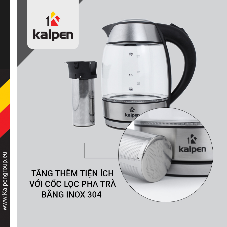 Ấm siêu tốc thủy tinh KK66 Kalpen được tặng thêm cốc pha trà tiện lợi bằng Inox 304.