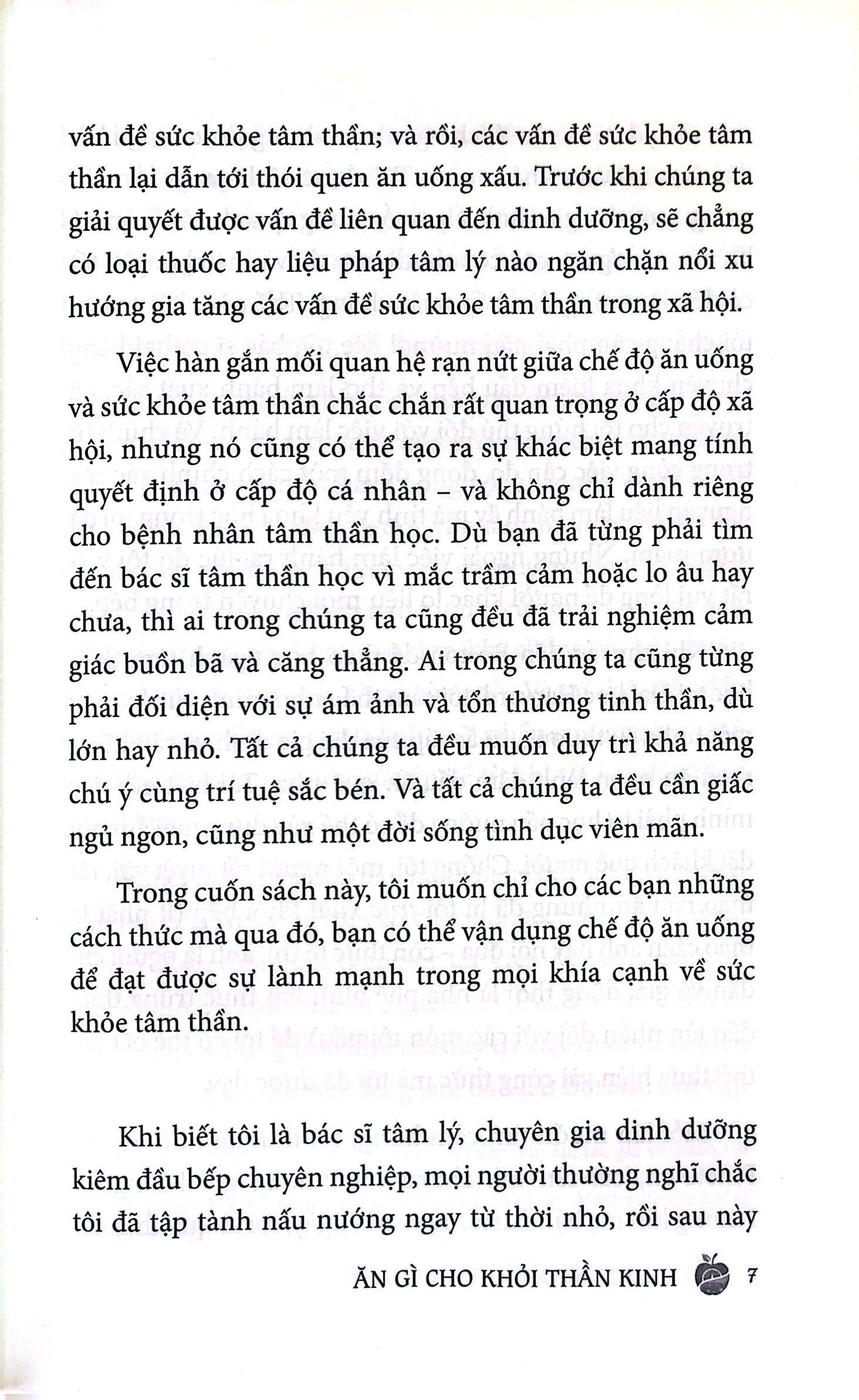 ĂN GÌ CHO KHỎI THẦN KINH là cuốn cẩm nang toàn diện về cách lựa chọn, sử dụng và chế biến thực phẩm để hỗ trợ sức khỏe tâm thần của mỗi chúng ta. Cuốn sách này, đến từ vị chuyên gia đầu ngành trong lĩnh vực dinh dưỡng tâm thần học, sẽ trang bị cho bạn những kiến thức dinh dưỡng quý giá để tăng cường hệ miễn và đối phó với các bệnh trạng về tâm lý.