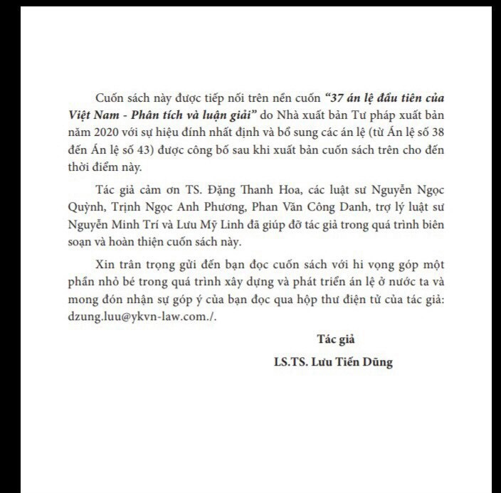 Án lệ Việt Nam - Phân tích và luận giải (Tập 1 từ án lệ 01 đến án lệ 43) tái bản lần thứ hai Tác giả: LS.TS Lưu Tiến Dũng Nhà xuất bản: Tư Pháp Ngày xuất bản: Tháng 9/2024 Khổ sách: 17×24cm Số trang: 852 Hình thức bìa: Bìa Mềm Lời tác giả: “Gần ba mươi năm trước đây, tôi cảm thấy mình rất may mắn được làm thư ký tại một số phiên tòa giám đốc thẩm của Hội đồng Thẩm phán Tòa án nhân dân tối cao. Tại đó, tôi đã được nghe các ý kiến thảo luận, tranh luận tuyệt vời của các thành viên Hội đồng Thẩm phán về các tình tiết của vụ án, các quy định của pháp luật cần được áp dụng và đường lối xét xử đối với những vụ án cụ thể được đưa lên nấc thang cao nhất của quyền lực tư pháp để phán định. Có những vụ án đã xử đi, xử lại hàng chục lần trong khoảng thời gian cả chục năm trời để rồi cuối cùng mới tìm được câu trả lời đúng sai tại phòng xét xử của Hội đồng Thẩm phán Tòa án nhân dân tối cao. Để đưa ra câu trả lời đúng sai đó, các thành viên Hội đồng Thẩm phán với những bộ óc có quyền lực tư pháp cao nhất đã “lật đi, lật lại các tình tiết khách quan, các vấn đề pháp lý, “trao đi, đổi lại” cách hiểu và giải thích các quy định cụ thể của pháp luật. Nhiều lúc tôi đã từng tự hỏi tại sao các phán quyết có giá trị cao nhất này lại không được áp dụng đối với các vụ án tương tự khác. Nhưng thực sự, tôi chưa bao giờ dám nghĩ đến việc sẽ có một thời khắc nào đó, Việt Nam - một đất nước theo truyền thống dân luật, lại có thể cho phép áp dụng án lệ. Vậy mà giờ đây, án lệ đã thành một phần không thể thiếu của nền tư pháp nước nhà. Khi đó, những người thư ký phiên tòa của Hội đồng Thẩm phán như tôi không có máy tính, phải cố gắng ghi chép vội vào quyển sổ công tác các ý kiến, lập luận, quyết định và căn cứ đưa ra quyết định của Hội đồng Thẩm phán, và đương nhiên là không thể nào đầy đủ. Có lẽ, đó cũng là một trong những lý do mà các quyết định của Hội đồng Thẩm phán, bao gồm cả các án lệ bây giờ, thường quá ngắn gọn và cô đọng không thể hiện đầy đủ. Tôi đã dành khá nhiều thời gian nghiên cứu một cách hứng thú ngay từ những án lệ đầu tiên được công bố. Cảm nhận ban đầu và cũng là xuyên suốt quá trình nghiên cứu là các kết luận tại các án lệ đều rất hợp lý. Cảm nhận kế tiếp của tôi là không đơn giản để hiểu rõ và hiểu hết các cơ sở đưa ra các kết luận đó. Hàng loạt các câu hỏi được đặt ra khiến tôi càng thấy thú vị nghiền ngẫm các án lệ. Liệu các án lệ đó được xây dựng vì chưa có các quy định của pháp luật, không thể áp dụng tương tự pháp luật và không có tập quán để áp dụng? Liệu các án lệ đó là để “giải thích” hay làm rõ các quy định của pháp luật còn có cách hiểu khác nhau hoặc chưa rõ ràng? Hay các án lệ đó là để chỉ ra cho các Tòa án các cấp phải áp dụng đúng các quy định sẵn có của pháp luật?... Tác giả cố gắng và thử tìm câu trả lời đối với từng án lệ trong cuốn sách này với hy vọng sẽ góp phần hiểu rõ hơn bản chất pháp lý của từng án lệ và khái quát hơn nữa các nội dung án lệ nhằm có thể tham khảo phù hợp hơn trong các vụ việc có tình tiết tương tự. Với cách tiếp cận đó, khi phân tích và luận giải từng án lệ, trước hết tác giả sẽ trích dẫn các quy định của pháp luật liên quan đến án lệ đó. Quy định của pháp luật liên quan được trích dẫn không chỉ giới hạn ở các quy định đã liệt kê trong phần đầu của án lệ mà còn các quy định khác của pháp luật tác giả cho rằng có liên quan đến vấn đề pháp lý được giải quyết trong tình huống nêu tại án lệ đó. Tiếp theo, tác giả cố gắng “lý giải” các kết luận pháp lý của án lệ thông qua việc phân tích các quy định của pháp luật liên quan để cùng bạn đọc tìm câu trả lời phù hợp cho các câu hỏi trên đây. Cuối cùng, tác giả nêu một số vấn đề có thể cần lưu ý khi áp dụng án lệ cụ thể sau khi đã phân tích và luận giải. Tiêu đề cho từng án lệ trong cuốn sách này trong phần Mục lục và trước phần trích dẫn nguyên văn từng án lệ là của tác giả. Đối với những án lệ không có tiêu đề, tác giả dựa trên vấn đề pháp lý được giải quyết trong các án lệ đó để đặt tiêu đề. Cuốn sách này được tiếp nối trên nền cuốn “37 án lệ đầu tiên của Việt Nam - Phân tích và luận giải” do Nhà xuất bản Tư pháp xuất bản năm 2020 với sự hiệu đính nhất định và bổ sung các án lệ (từ Án lệ số 38 đến Án lệ số 43) được công bố sau khi xuất bản cuốn sách trên cho đến thời điểm này. Tác giả cảm ơn TS. Đặng Thanh Hoa, các luật sư Nguyễn Ngọc Quỳnh, Trịnh Ngọc Anh Phương, Phan Văn Công Danh, trợ lý luật sư Nguyễn Minh Trí và Lưu Mỹ Linh đã giúp đỡ tác giả trong quá t