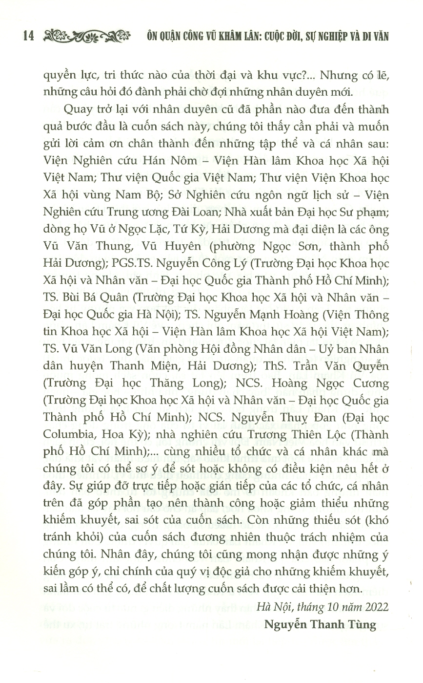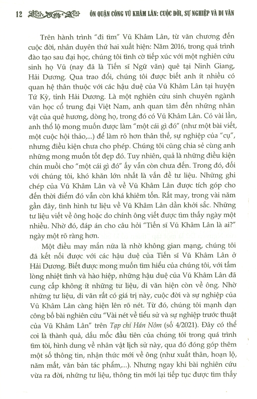 Ôn Quận công Vũ Khâm Lân: Cuộc đời, sự nghiệp và di văn là công trình công bố đầy đủ nhất những tư liệu nguyên cấp liên quan đến Vũ Khâm Lân, trong đó có nhiều tư liệu quý còn ít được biết đến. Các tư liệu được giải mã, chuyển ngữ với nỗ lực cao nhất. Đồng thời, từ việc “đọc sâu”, đọc liên văn bản, cuốn sách tái dựng được tương đối rõ nét “bức chân dung” nhà nho – học giả – quan chức Vũ Khâm Lân, cũng như tái định vị được phần nào vị trí của ông trong “bức tranh” Đại Việt thế kỉ XVIII nói riêng và trong lịch sử văn hoá Việt Nam nói chung.
