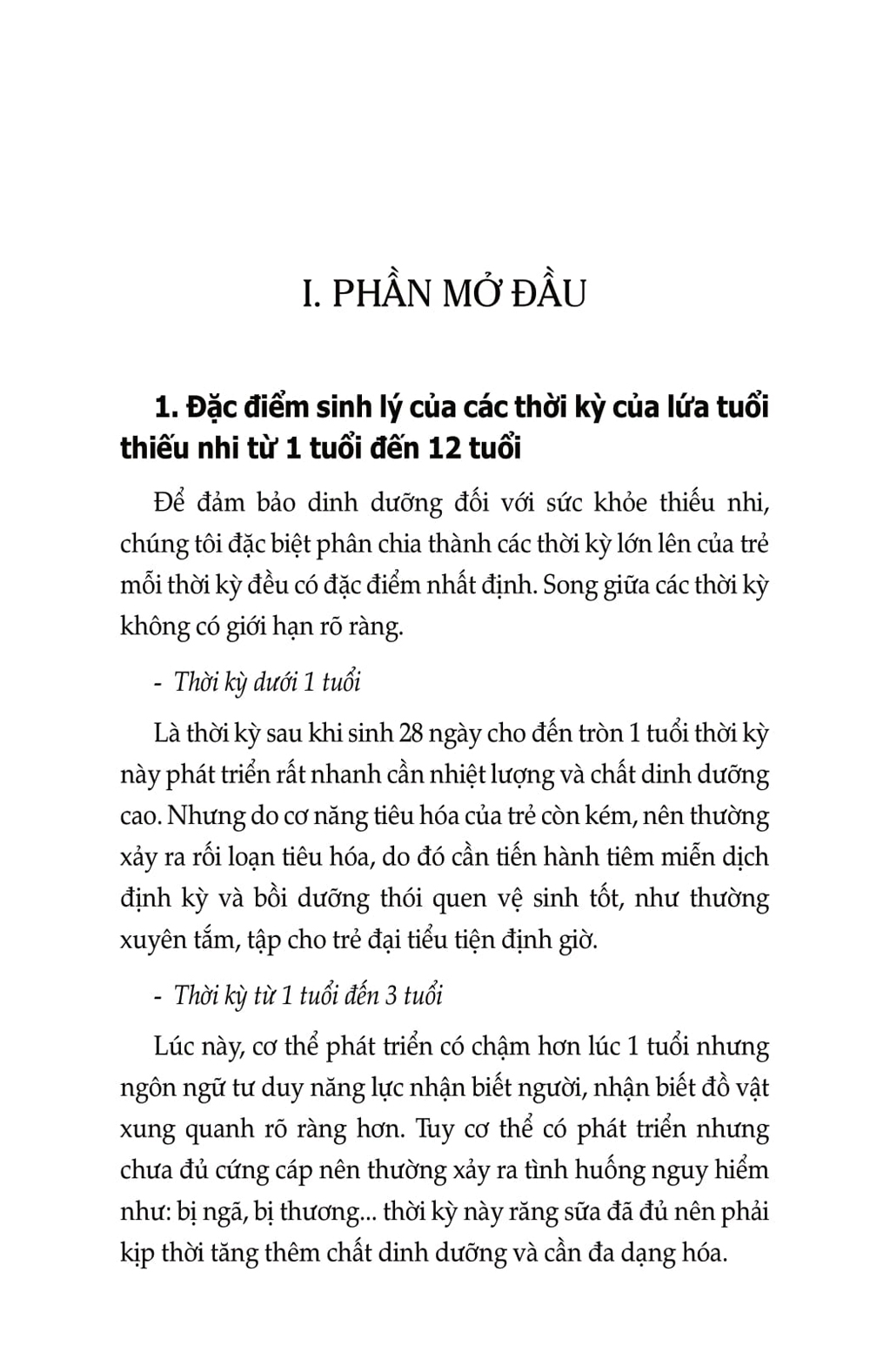 Sách trình bày đặc điểm sinh lý của các thời kỳ của lứa tuổi thiếu nhi từ 1 tuổi đến 12 tuổi, đặc điểm phát triển các hệ thống của thiếu nhi, 5 tố chất dinh dưỡng chủ yếu, điều tiết ẩm thực và bảo vệ sức khỏe thiếu nhi; giới thiệu 15 loại thực phẩm và 130 món ăn dành cho trẻ nhỏ; các phương thức chăm sóc sức khỏe thiếu nhi,…
