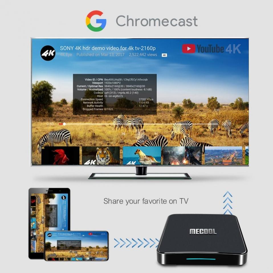 Android TV Box Mecool KM1 4GB Ram Android TV 9 Bản quyền Google ATV điều khiển giọng nói km1 phiên bản quốc tế điều khiển giọng nói có tiếng Việt RAM: 4GB Rom DDR4 : 32G CPU: Amlogic S905X3 Wifi kép 2.4G & 5G mới, chip wifi 2 băng tầng Hệ điều hành Android TV ATV 9 bản quyền google version Bluetooth 4.2 Cài sẵn ứng dụng xem phim, tivi truyền hình cáp miễn phí vĩnh viễn Chống lag và giật khi sửdụng, thời gian khởi động nhanh Cài đặt sẵng kho ứng dụng miễn phí xem phim, karaoke, đọc báo, lướt web, coi truyền hình Xem truyền hình cáp trên 150 kênh miễn phí vĩnh viễn Karaoke suốt cả ngày với các ứng dụng Karaoke chuyên nghiệp đã được cài đặt sẵn. Có thể cắm Amply , Hát Karaoke, Thay thế đầu PS kết nối loa không dây Sản phẩm có sự đột phá trong công nghệ voice  Chỉ cần nói tên bài hát bất kỳ thiết bị tìm kiếm ra kết quả không cần nhập từng ký tự CÓ TÌM KIẾM GIỌNG NÓI BẰNG TIÊNG VIỆT   km1 của Mecool được cài đặt HĐH AndroidTV 9 được Google cấp phép chứ không phải là các HĐH AndroidTV tùy chỉnh không cấp phép như đại đa số các box hiện nay. Sản phẩm chính chủ sẽ được hỗ trợ tốt từ NHÀ SẢN XUẤT cũng như Google giúp người dùng sử dụng ổn định Thiết kế đẹp và sang trọng TV Box MECOOL KM1 nổi bật với thiết kế ngoài sang trọng, sử dụng chất liệu nhựa cao cấp tạo nên cái nhìn ấn tượng bởi logo MECOOL khắc nổi ở mặt trước. Android TV Box MECOOL km1 được tích hợp thêm một chiếc đèn LED để báo tín hiệu trang thái sử dụng của thiết bị Mặt sau được trang bị khe tản nhiệt bằng hợp kim chắc chắn và cứng cáp toát lên vể sang trọng cho thiết bị. Hệ Điều Hành mecool km1 ATV 9.0 Và Chip Xử Lý S905X3 Mecool Km 1 được chạy hệ điều hành Android TV 9.0 chính chủ Google giúp người dùng có thể cải thiện tốc độ xử lý của đầu box, nhưng hệ điều hành này lại không chiếm quá nhiều dung lương bộ nhớ của đầu box chắc chắn sẽ mang lại cho bạn một trải nghiệm tuyệt vời nhất. Ngoài ra Mecool km1 được trang bị chip xử lý Amlogic S905X3 mới với cấu hình mạnh mẹ đáp ứng mọi nhu cầu giải trí của bạn hỗ trợ đầy đủ video 4K UHD cao cấp, CPU 64bit mạnh mẽ kết hợp Cortex A53,Quad Core xử lý đồ họa 4K tốt hơn so với hầu hết các sản phẩm trên thị trường.   Cấu hình mạnh mẽ với bộ nhớ trong mở rộng Trang bị bộ nhớ RAM 4GB DDR4 cho hiệu suất cao, với bộ nhớ mở rộng dùng để lưu trữ nhiều phần mềm, ứng dụng xem phim, xem truyền hình, hát karaoke cùng các game khủng, bộ sưu tập nhạc, xem phim offline… Đặc biệt, MECOOL km1 được nâng cấp với công nghệ chip Wi-Fi MIMO giúp bắt sóng wifi tốt, không bị nhiễu với đường truyền liên tục và tốc độ nhanh hơn. Tích hợp thêm Wifi 2 băng tần 2.4Ghz và 5Ghz tăng khả năng bắt sóng tối ưu. Voice Remote hỗ trợ tìm kiếm bằng giọng nói MECOOL km1 là hộp truyền hình được chứng nhận bản quyền bởi Google và được tích hợp sẵn một số tính năng vượt trội. Đặc biệt nhất là khả năng nhận diện giọng nói nhanh nhạy, tìm kiếm nội dung dễ dàng, dù ở khoảng cách xa, dựa trên điều khiển remote kèm theo Box. Lưu ý hỗ trợ cả tiếng việt                           Hình ảnh tái tạo sắc nét Cập nhật Firmware mới tự động qua OTA Giống như các dòng Android TV Box khác của thương hiệu MECOOL, KM1 cũng được hỗ trợ cập nhật Firmware tự động qua OTA. Để đảm bảo người dùng trên toàn thế giới đều nhận được các bản cập nhật mới nhất mà không cần thực hiện bất kỳ thao tác phức tạp nào, chỉ cần có kết nối Internet thì sẽ nhận được bản phần mềm, rất hay và tiện dụng. TẤT CẢ ĐÃ CÓ TRONG THIẾT BỊ ANDROID TV  Thông Số Kĩ Thuật: Specification General Brand: MECOOL Model: KM1 Type: TV Box GPU: Mali-G31 System: Android 9.0 CPU: Amlogic S905X3 Core: Quad Core RAM: 4G RAM RAM Type: DDR4 Color: Black Media Supported Decoder Format: H.263, H.264, H.265, HD MPEG4 Audio format: AAC, AAC, FLAC, AVE, MP3, OGG, RM, WMA, WMV Video format: VP9 Profile-2 up to 4Kx2K @ 60fps H.265 HEVC [email protected] up to 4Kx2K @ 60fps AVS2-P2 Profile up to 4Kx2K @ 60fps H.264 AVC [email protected] up to 4Kx2K @ 30fps Photo Format: JPG, JPEG, BMP, GIF, PNG, JFIF etc photo format Support 5.1 Surround Sound Output: Yes Product Details 5G WiFi: Yes WIFI: 802.11 b/g/n/ac Bluetooth: Bluetooth 4.2 Power Supply: Charge Adapter Interface: AV,DC 5V,HDMI,LAN,TF card,USB2.0,USB3.0 Antenna: Yes Language: Multilanguage HDMI Version: 2.1 Other Functions: Chromecast,Google Assistant,Others HDMI Function: HDCP Power Consumption.: 5W RJ45 Port Speed: 10/100Mbps Power Requirement Power Type: External Power Adapter Mode Power Input Vol: 5V Power Adapter Input: 100-240V / 50-60Hz Power Adapter Output: 5V 2A Battery Information Remote Controller Battery: 2 x AAA Battery ( not included )