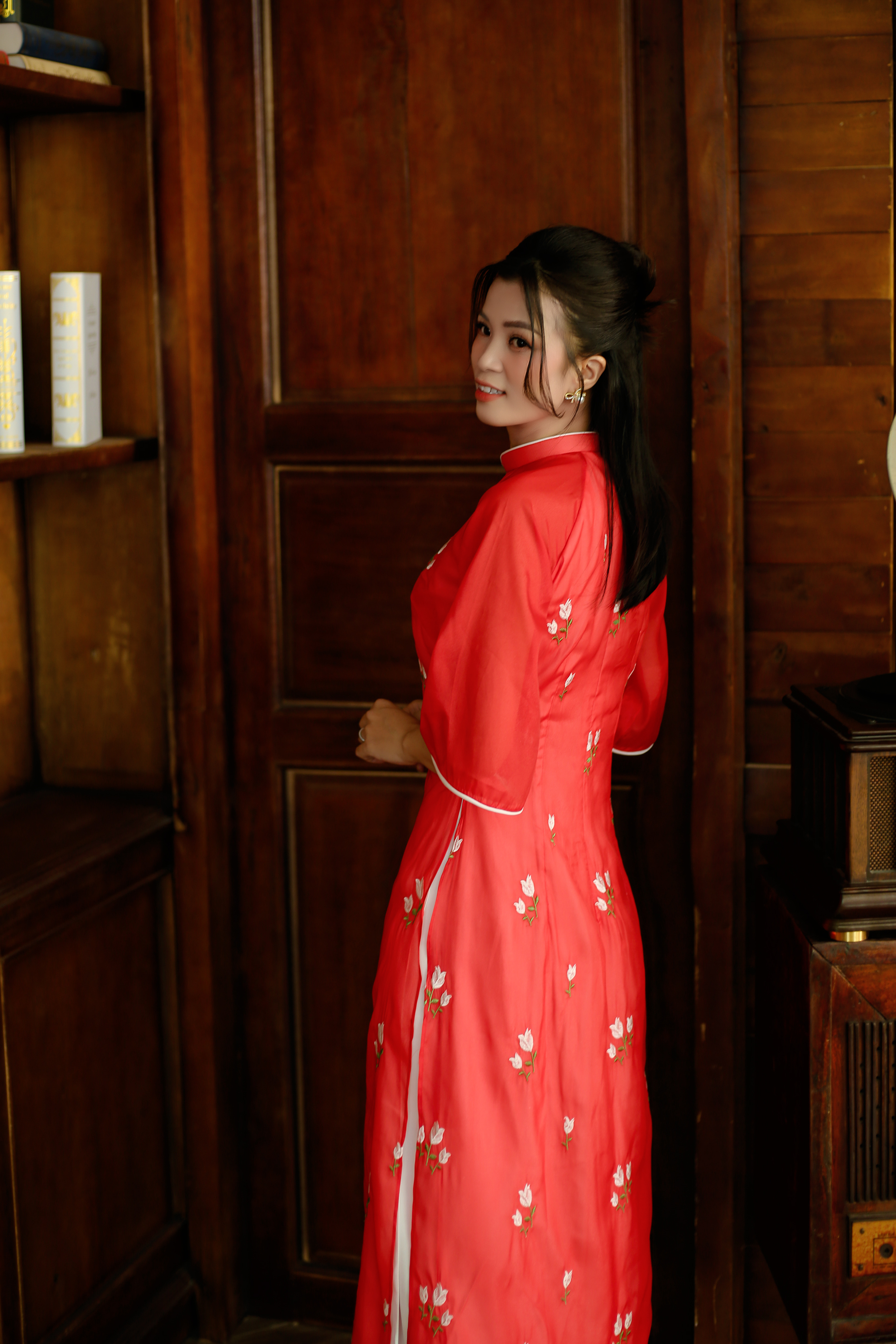 áo dài đỏ form suong may chất liệu lụa gấm kết hoa sen, tay lỡ loe, quần lụa trắng