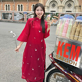 Áo dài cách tân nữ 4 tà CHAANG May thiết kế hoa nổi đính ngọc vải lụa tơ hồng đẹp