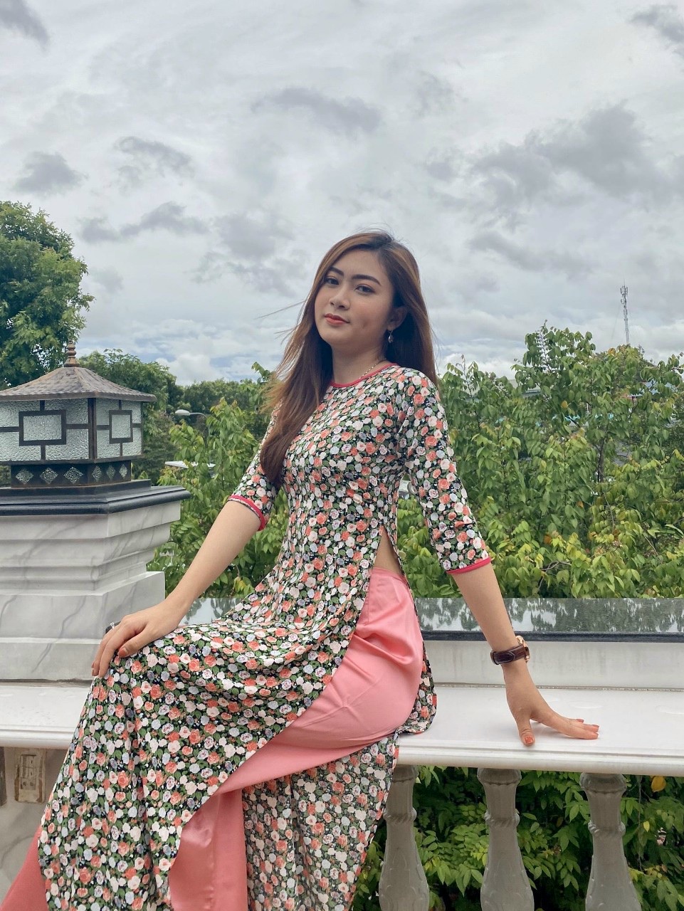 Thiết kế Áo dài nữ hồng vàng họa tiết hoa hồng cao cấp phong cách đường may tỉ mỉ. Áo thiết kế form vừa vặn giúp tôn được đường nét phong cách của các tính