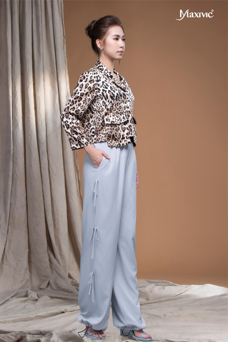 Áo sơ mi La Mộc họa tiết da beo thể hiện được nữ quyền. Thiết kế tay lỡ phồng và nhún nhẹ mang đến cảm giác thanh lịch cho nàng. Thiết kế với sự chỉnh