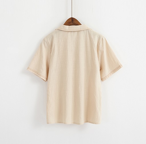 Áo sơ mi cổ bẻ, có nút nhựa ở giữa, tay ngắn, áo 1 lớp, có túi