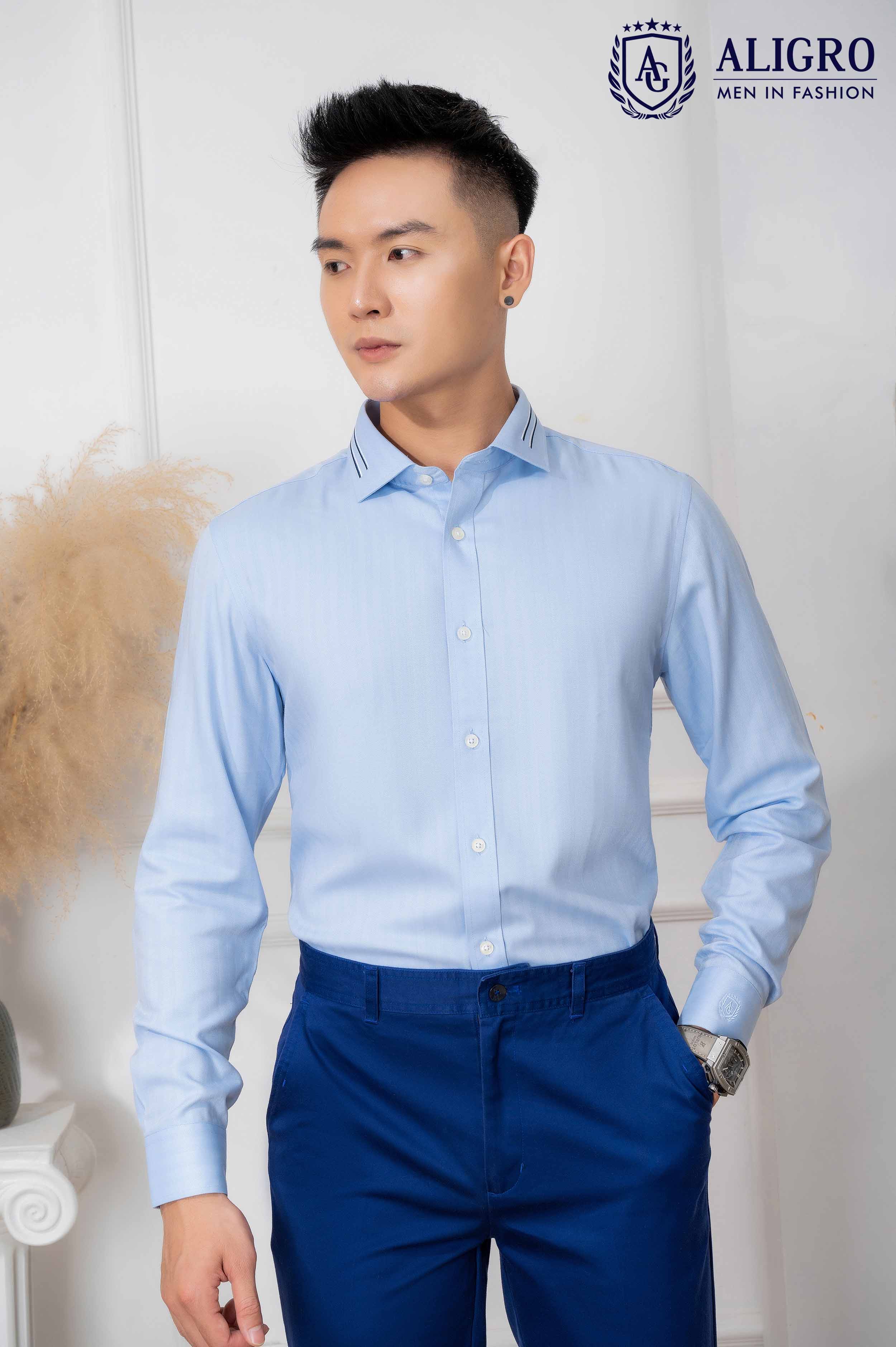 ✨Áo sơ mi nam dài tay ALIGRO 100% chất bamboo Màu Xanh phối cổ bẻ dáng ôm body ALGS214