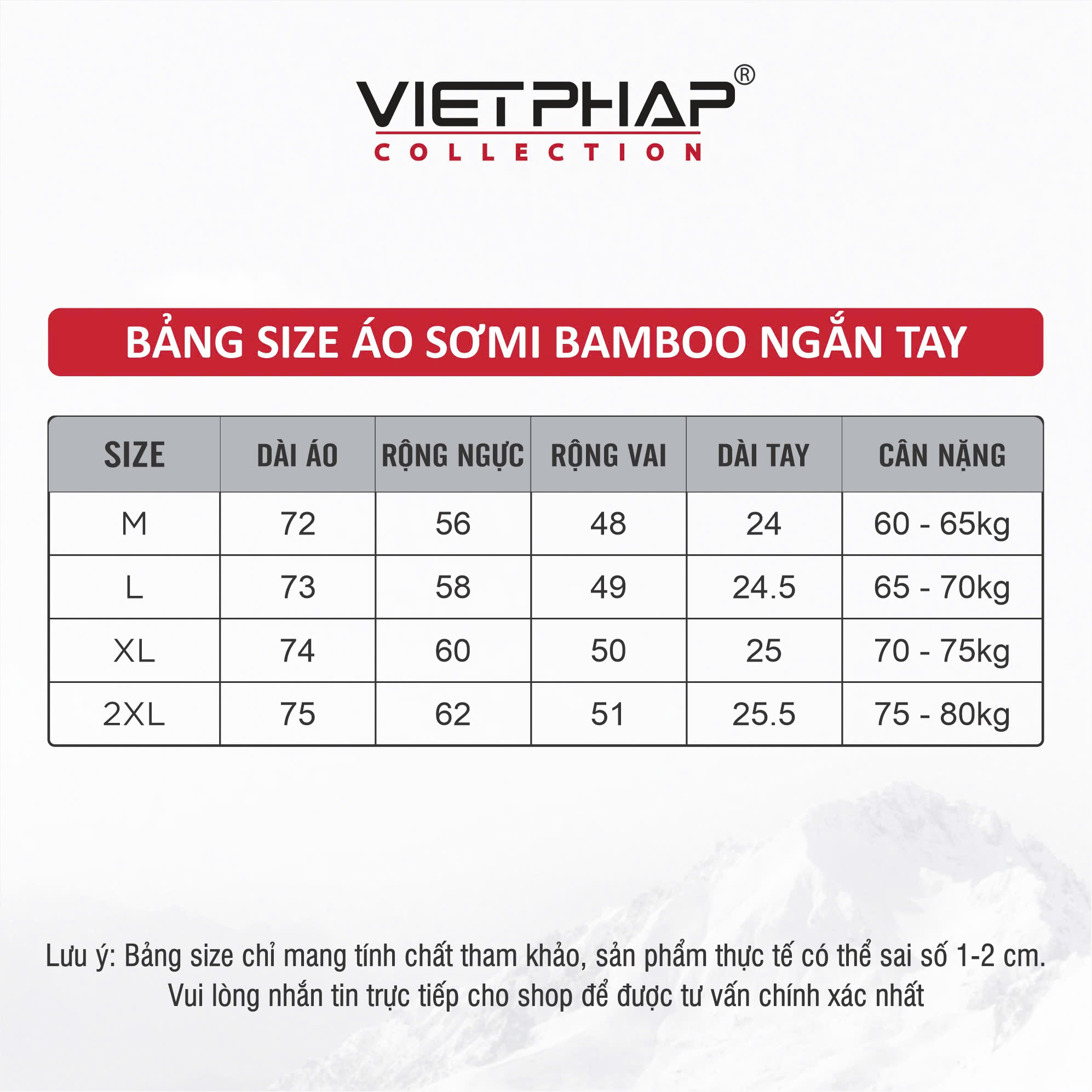 - Đổi trả hàng theo đúng quy định của Tiki VietPhap Collection Sản xuất tại: CTY TNHH May Mặc – Thời Trang Việt Pháp Cùng bạn làm nên phong cách! LƯU Ý: - Bảng size chart chỉ mang tính chất tham khảo, tùy thuộc vào số đo cơ thể mỗi người và chất liệu vải khác nhau sẽ có sự chênh lệch nhất định từ 1 - 2cm.
