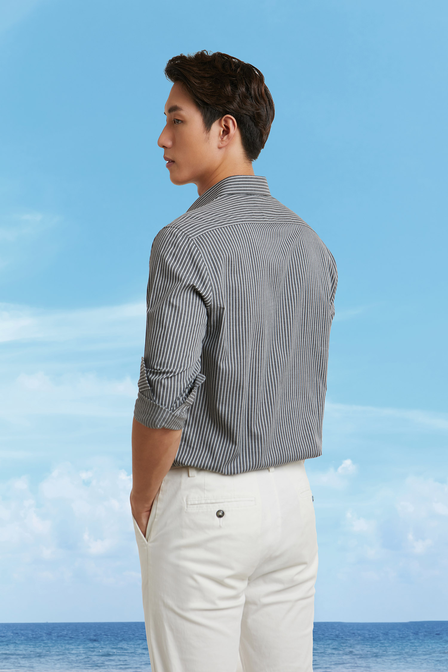 Áo sơ mi nam trung niên, Áo sơ mi nam công sở Anton, Áo sơ mi Dài Tay Màu Ghi Vải Cotton Kẻ Sọc Đen- AC151 Vải cotton thoáng mát, thấm hút tốt, mềm mịn