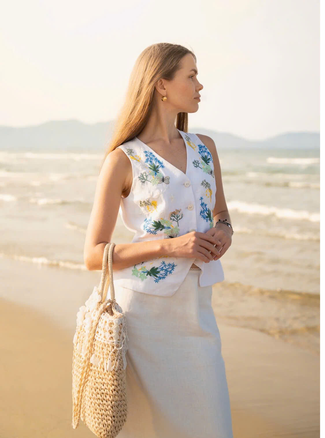 Chào đón "ngôi sao" mới gia nhập Bộ sưu tập thêu tay "Mơ" danh tiếng của Hity – Áo Vest Linen Thêu Tay Mơ, một thiết kế mang trọn vẹn hơi thở phóng khoáng và vẻ đẹp rực rỡ của miền nhiệt đới.