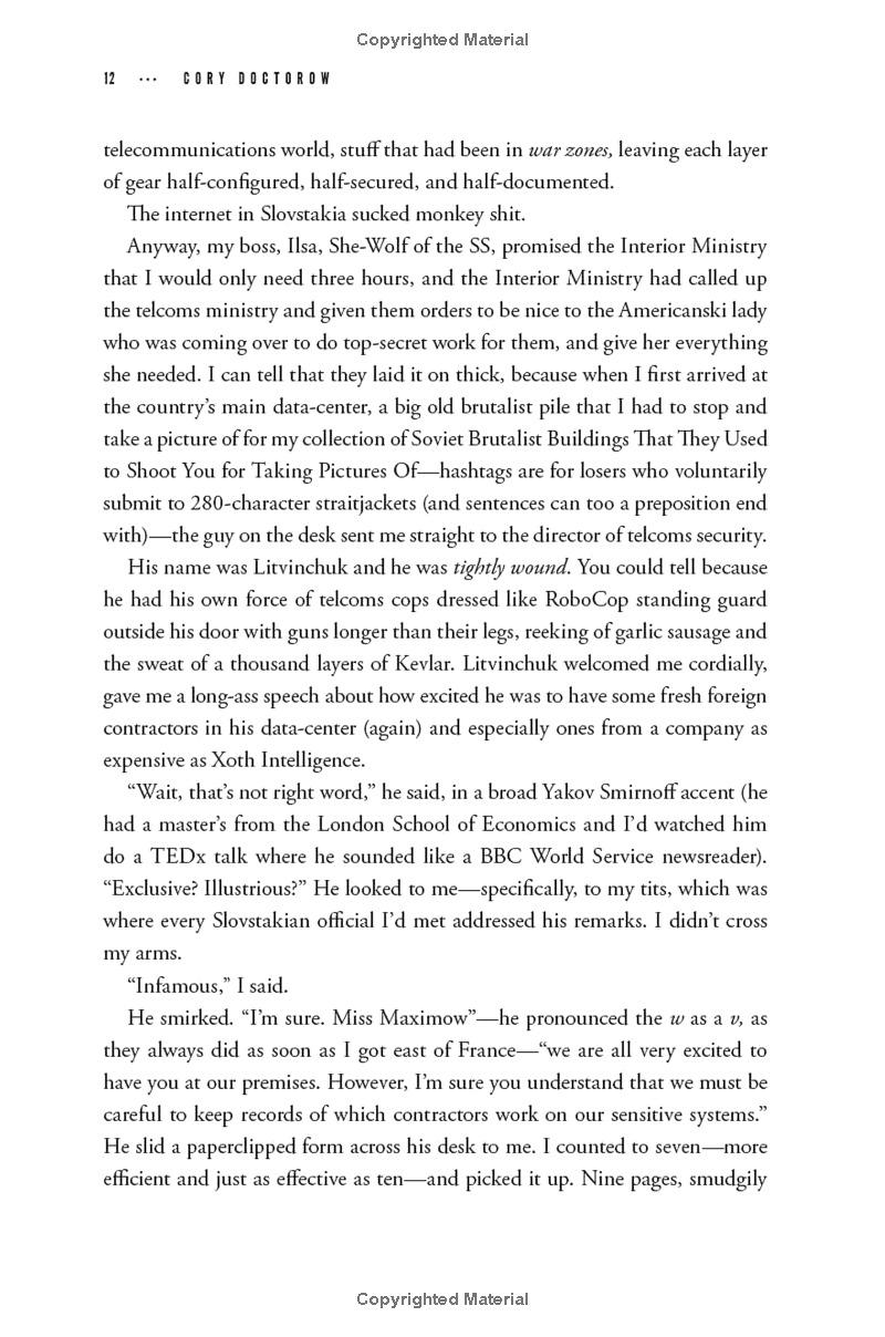 Masha works for Xoth Intelligence, an InfoSec company upgrading the Slovstakian Interior Ministry's ability to spy on its citizens' telecommunications with state-of-the-art software (at least, as state-of-the-art as Xoth is prepared to offer in its middle-upper pricing tier).