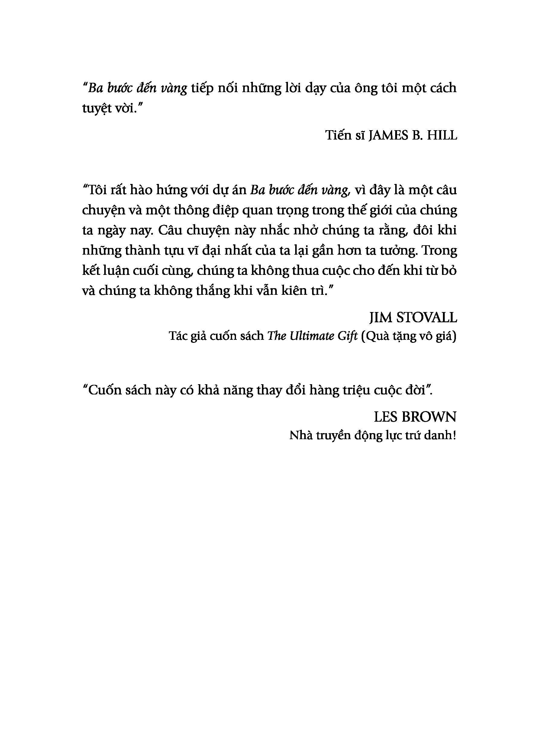 Ba bước đến vàng chia sẻ những tinh hoa và tư vấn từ rất nhiều con người phi thường, những người đã kiên trì vững bước trong những thời điểm khó khăn và trở thành hình mẫu cho tất cả chúng ta. Câu chuyện này được xây dựng dựa trên trải nghiệm thực tế của tác giả khi khám phá ra triết lý của Napoleon Hill đã truyền cảm hứng lớn lao cho thành công ngoài sức tưởng tượng của các nhà quản lý, nhà nhân đạo, vận động viên và doanh nhân. Tác giả đã viết ra một câu chuyện hấp dẫn; ngoại trừ ba nhân vật Mia, David và Jonathan Buckland, tất cả các nhân vật trong cuốn sách này đều có thật và chính tác giả có đặc ân là được nói chuyện trực tiếp với họ. Dũng khí và thành tựu của họ là có thật. Những bài học cuộc sống mà họ đưa ra là chân thành. Bố cục câu chuyện là những lời của chính Napoleon Hill đã viết ra vào đầu thế kỉ 20. Cho đến tận ngày hôm nay, những lời này vẫn còn mạnh mẽ như khi chúng được viết ra lần đầu tiên.