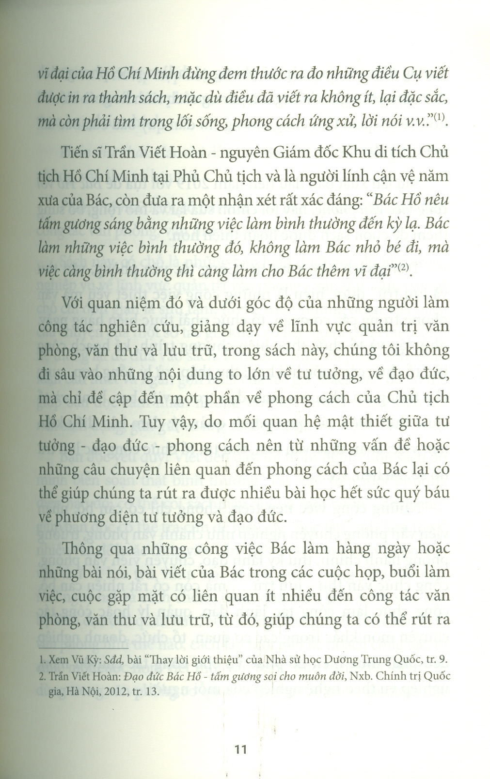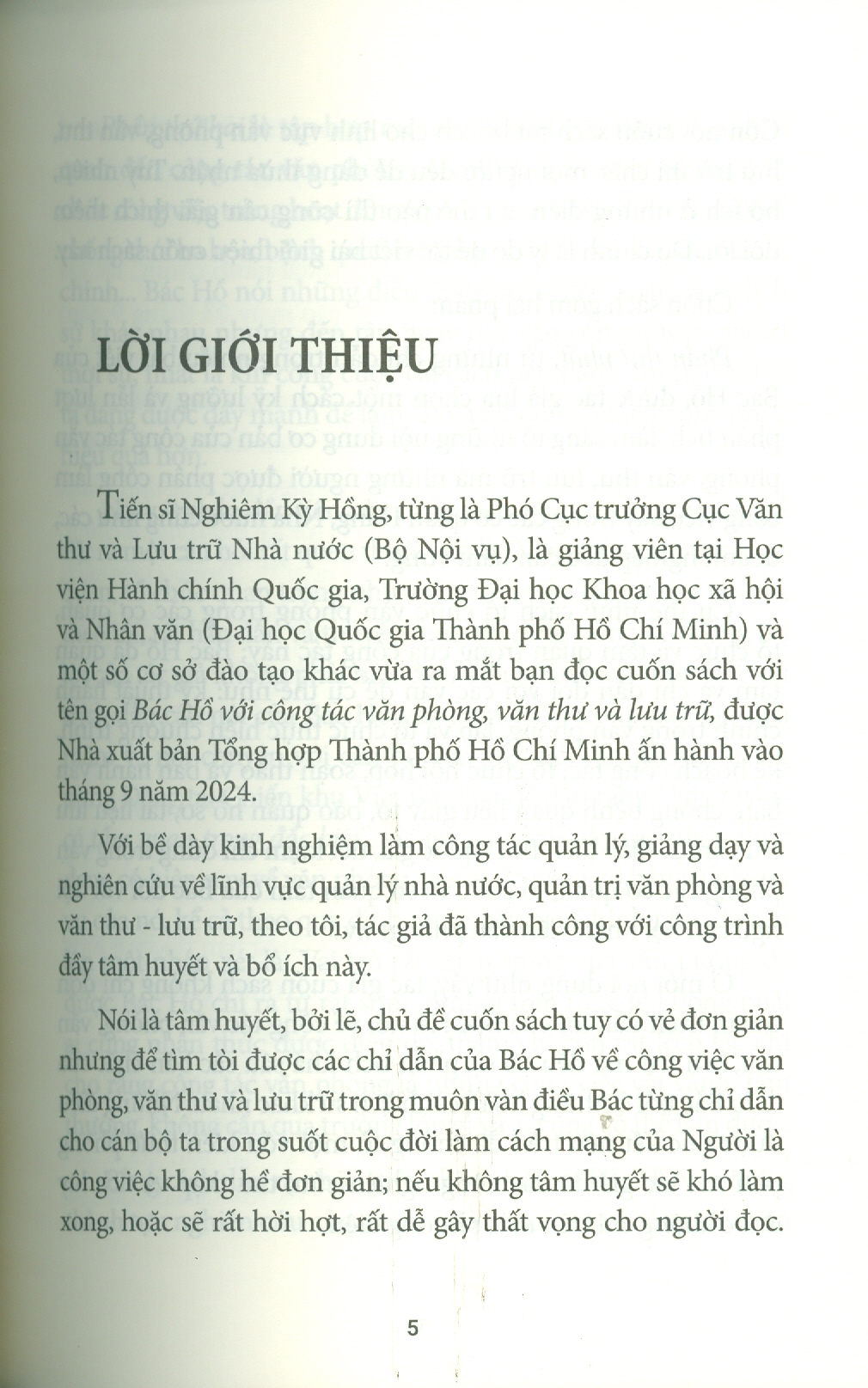 Phần thứ hai là tập hợp một số bài viết của Bác Hồ có liên quan đến công tác văn phòng, văn thư và lưu trữ như: óc tổ chức công việc trong hoạt động của Ủy ban nhân dân các cấp, về chống thói ba hoa, bệnh quan liêu, nạn giấy tờ, về cần kiệm liêm chính… Bác Hồ nói những điều đó trong nhiều hoàn cảnh lịch sử khác nhau nhưng đến tận ngày nay vẫn còn nguyên giá trị thời sự, nhất là khi công cuộc cải cách nền hành chính ở nước ta đang được đẩy mạnh để làm cho hoạt động quản lý nhà nước hiệu quả hơn. Bằng cách dẫn ra những lời nhắc nhở của Bác Hồ và những thành tựu nghiên cứu của nhiều nhà khoa học về công việc văn phòng, tác giả đã giúp người đọc hiểu một cách đầy đủ hơn về những công việc thầm lặng, nhưng rất có ý nghĩa thuộc lĩnh vực văn phòng, văn thư và lưu trữ.