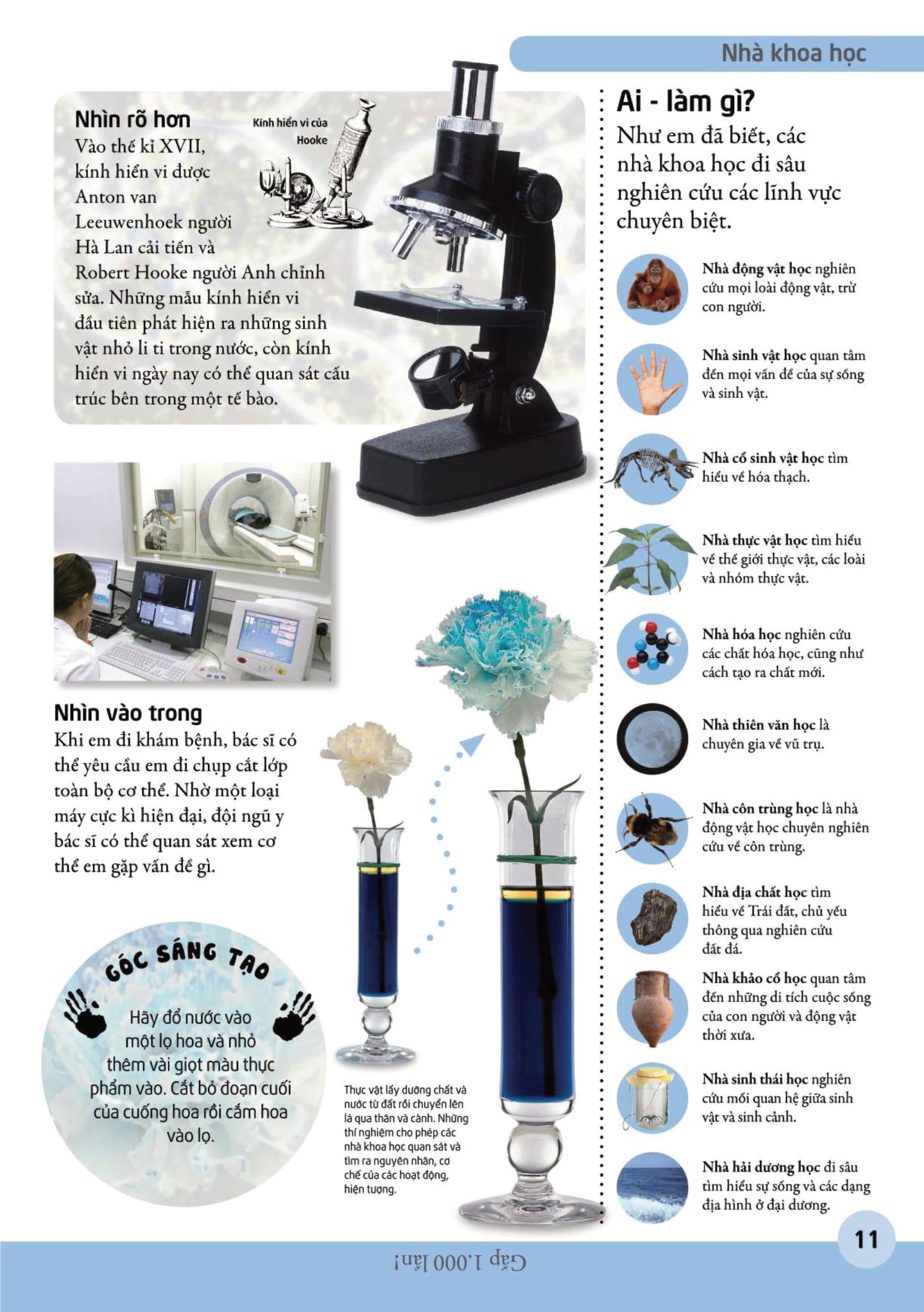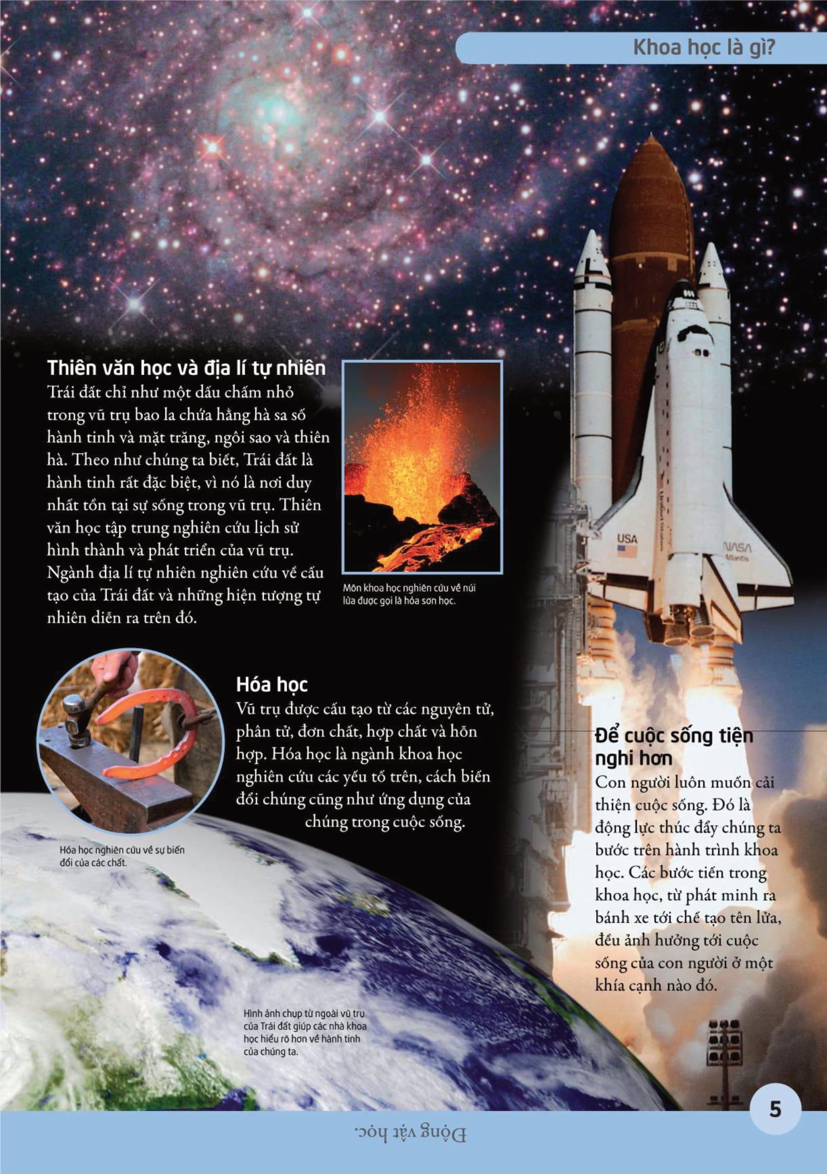 Với các hình minh họa trực quan sinh động, bắt mắt, cuốn sách cung cấp một lượng kiến thức phong phú, súc tích, dễ hiểu, cùng những câu hỏi vui, mẩu thông tin thú vị về khoa học. Em sẽ được tìm hiểu từng lĩnh vực mà khoa học nghiên cứu, từ sinh vật học, hóa học, vật lí tới thiên văn học. Bên cạnh đó, em có thể tìm trong cuốn sách các hướng dẫn và gợi ý giúp em thử làm nhà khoa học nhí nữa đấy.