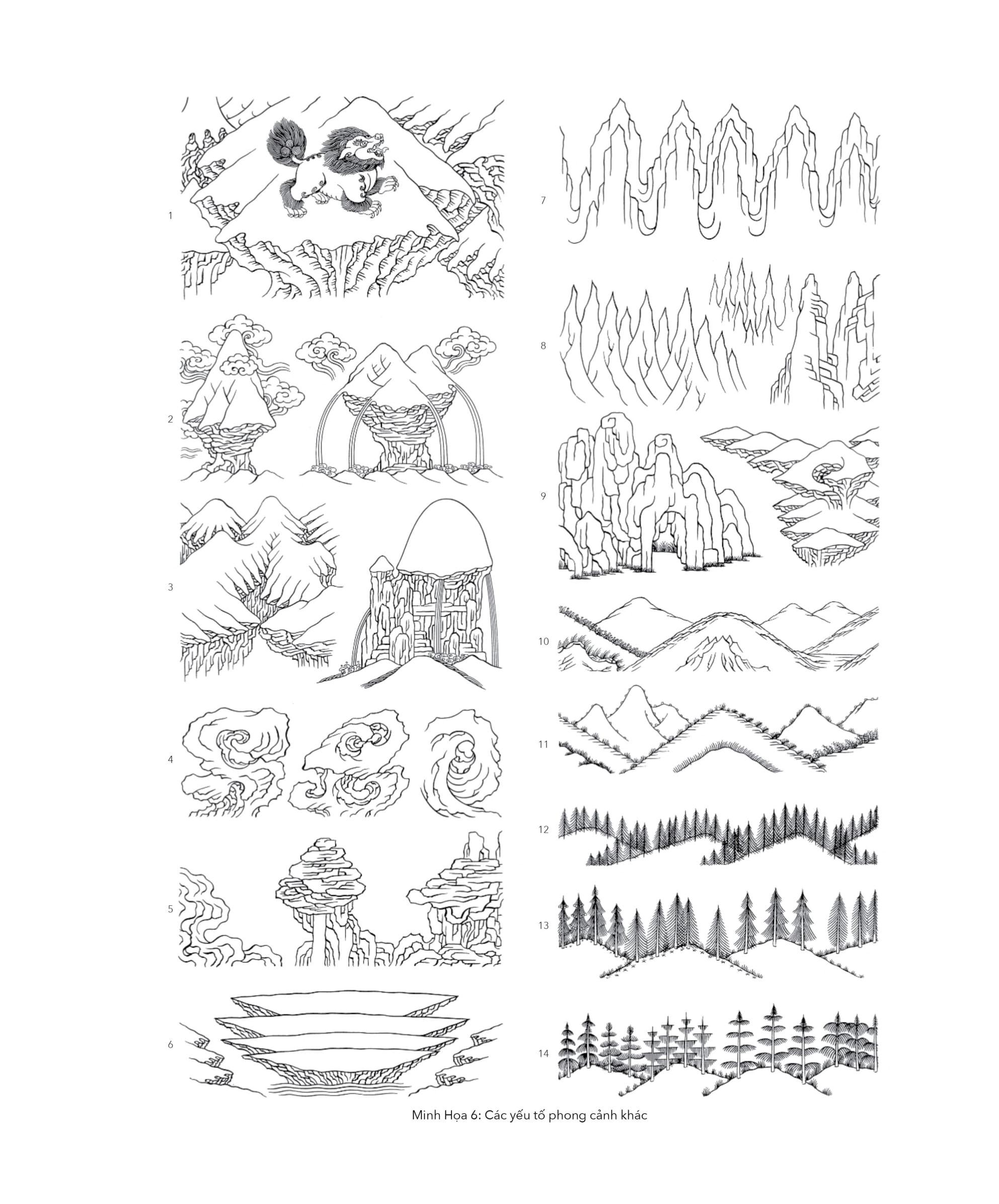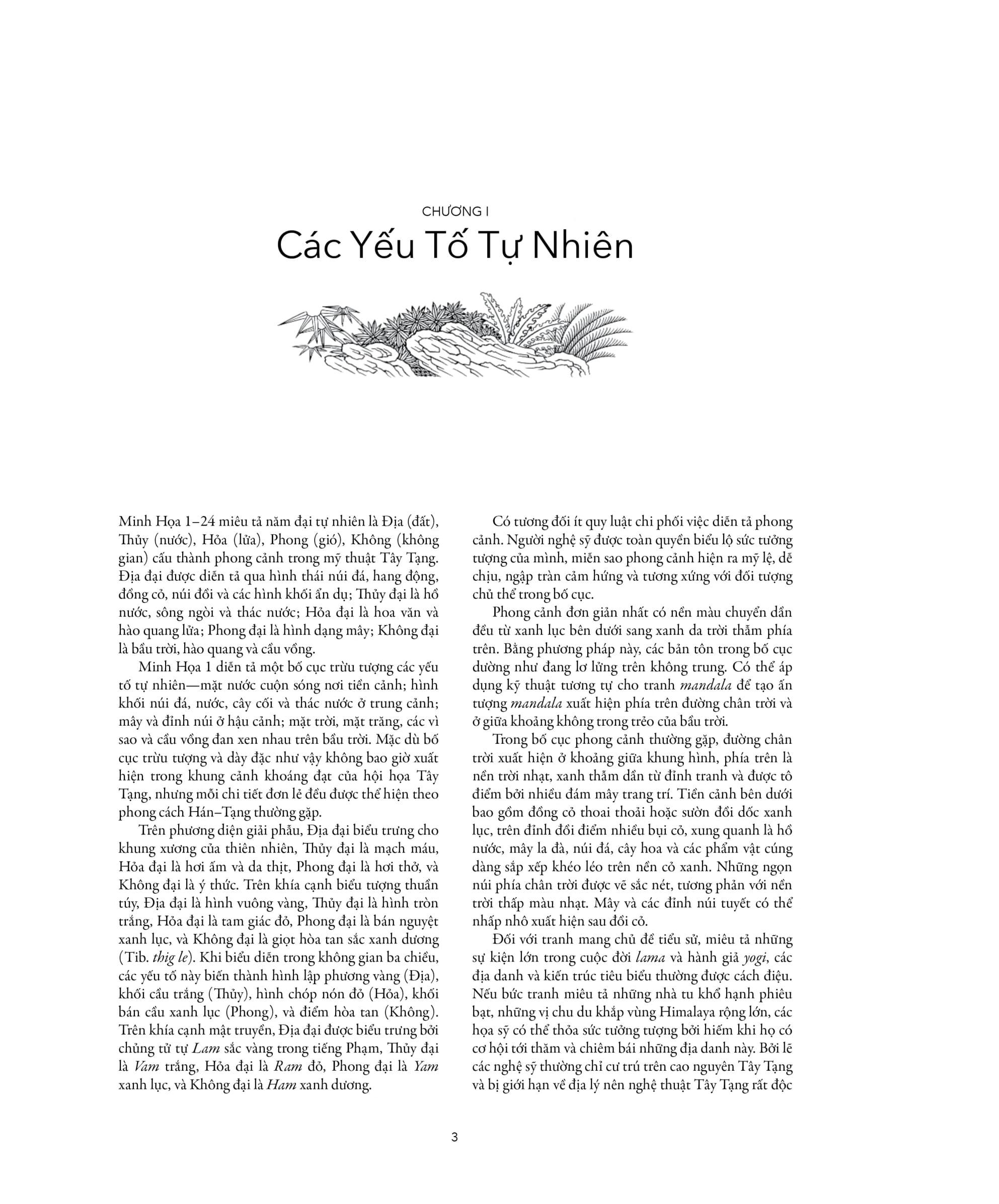 Mười hai chương sách được trình bày theo các chủ đề: (I) Yếu tố tự nhiên - hình khối núi đá, nước, lửa, mây và cầu vồng; (II) Thực vật - hoa sen, hoa, quả và cây cối; (III) Động vật- huyền thoại và thực tế; (IV) Tranh tường thuật; (V) Vũ trụ học - núi Tu Di, cúng dàng mandala, thiên văn học, thập âm thù thắng Thời Luân Kim Cương, bảo tháp và hệ thống kinh mạch luân xa Ấn Độ giáo, Phật giáo; (VI) Thủ ấn và các thế tay; (VII) Bảy bảo vật của Chuyển Luân Thánh Vương; (VIII) Những nhóm biểu tượng và phẩm vật cát tường; (IX) Phẩm vật an bình, ngọc báu và khí cụ nghi lễ; (X) Hình họa tổng hợp về pháp khí và v.ũ khí nghi lễ; (XI) Pháp khí, phẩm vật và trang sức phẫn nộ, torma, nội cúng dàng và thiết kế nền đốt hỏa cúng; (XII) Đường viền, hoa văn, chủ đề và thiết kế kỷ hà.