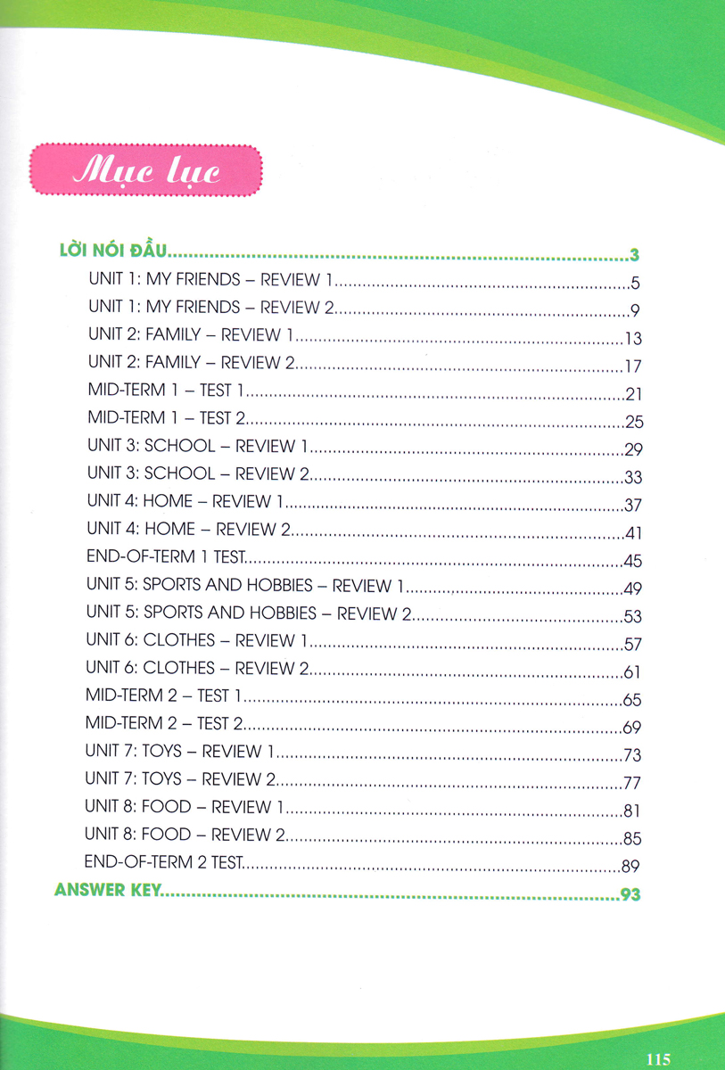 Phần 1: Unit Review and Tests (Các đề ôn tập và bài kiểm tra). Các đề ôn tập trong phần này sẽ được trình bày dưới dạng các bài luyện tập theo từng unit (Unit Review). Sau mỗi 2 hoặc 4 unit sẽ có một bài kiểm tra (Test) tương ứng với từng học kì để học sinh có thể tự kiểm tra .