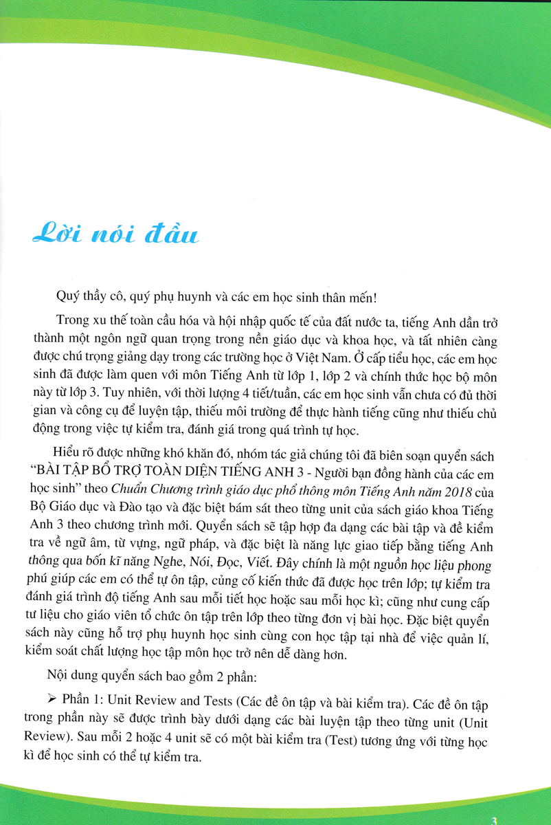 Bài Tập Bổ Trợ Toàn Diện Tiếng Anh 3 - Người bạn đồng hành của các em học sinh” theo Chuẩn Chương trình giáo dục phổ thông môn Tiếng Anh năm 2018 của Bộ Giáo dục và Đào tạo và đặc biệt bám sát theo từng unit của sách giáo khoa Tiếng Anh 3 theo chương trình mới.