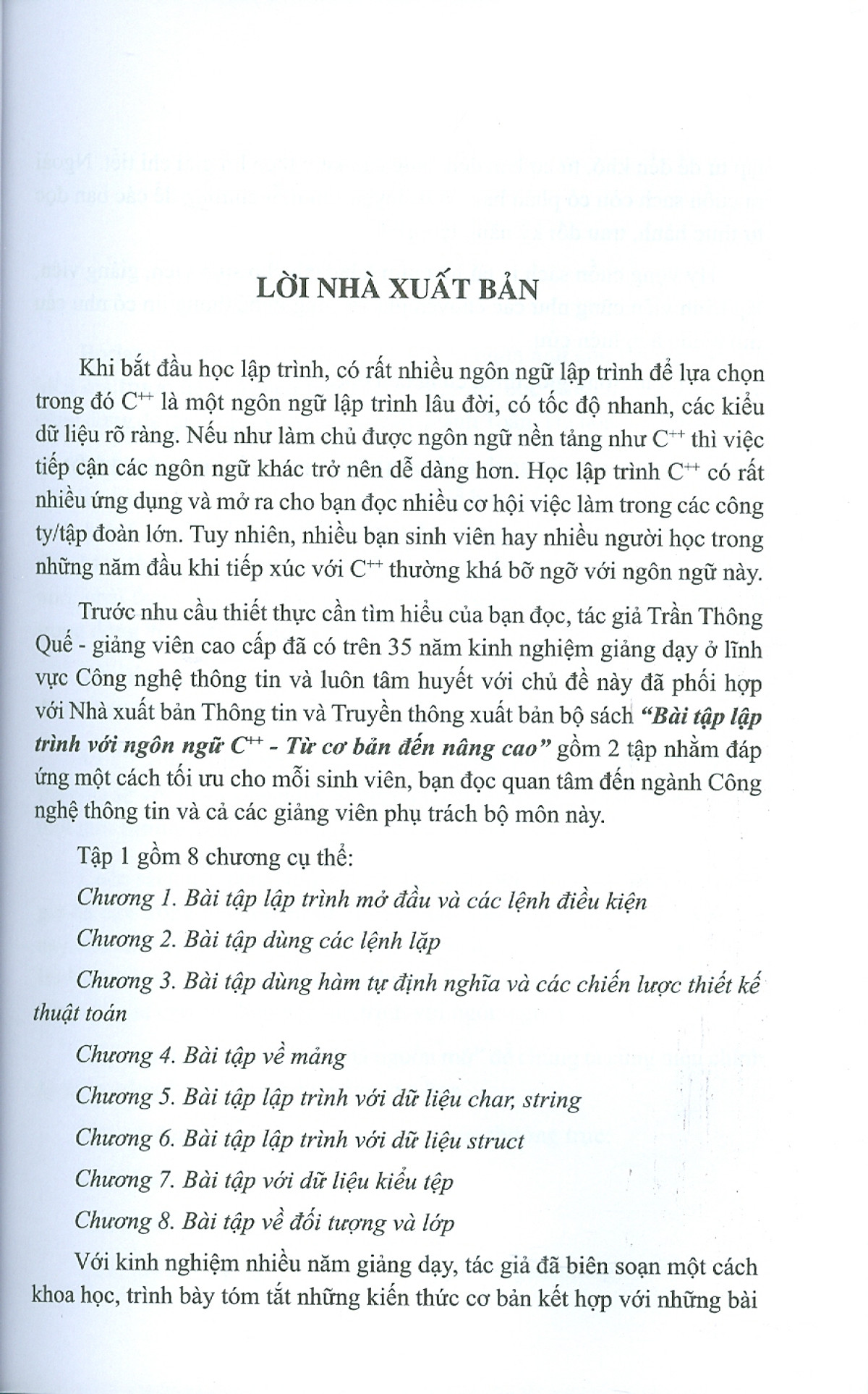 Với kinh nghiệm nhiều năm giảng dạy, tác giả đã biên soạn một cách khoa học, trình bày tóm tắt những kiến thức cơ bản kết hợp với những bài tập từ dễ đến khó, từ cơ bản đến nâng cao kèm theo lời giải chi tiết. Ngoài ra cuốn sách còn có phần bài tập tự luyện sau mỗi chương để các bạn đọc tự thực hành, trau dồi kỹ năng lập tình.