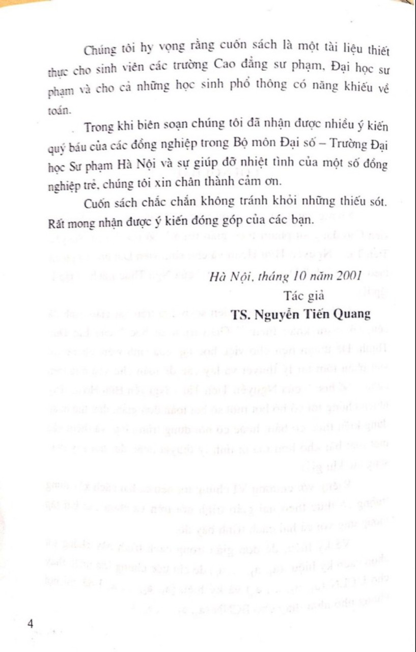 Chúng tôi hy vọng rằng cuốn sách là một tài liệu thiết thực cho sinh viên các trường Cao đẳng sư phạm , Đại học sư phạm và cho cả những học sinh phổ thông có năng khiếu về toán . Trong khi biên soạn chúng tôi đã nhận được nhiều ý kiến quý báu của các đồng nghiệp trong Bộ môn Đại số – Trường Đại học Sư phạm Hà Nội và sự giúp đỡ nhiệt tình của một số đồng nghiệp trẻ , chúng tôi xin chân thành cảm ơn . Cuốn sách chắc chắn không tránh khỏi những thiếu sót . Rất mong nhận được ý kiến đóng góp của các bạn . Hà Nội , tháng 10 năm 2001 Tác giả TS . Nguyễn Tiến Quang