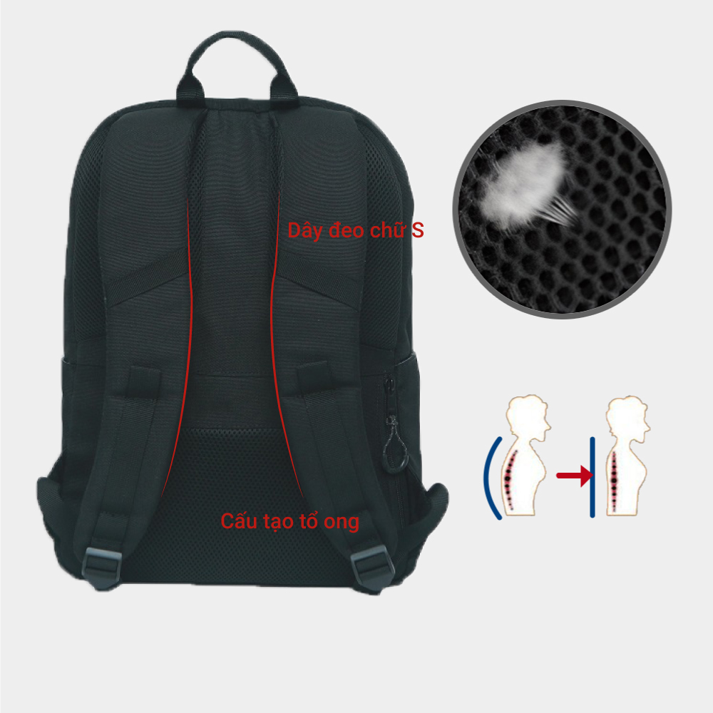 Quai đem thiết kế chữ S được cấu tạo bởi các lớp vải thoáng khí tổ Ong. Ôm sát vai & cơ thể người sử dụng hạn chế tình trạng gù lưng cho người sử dụng.