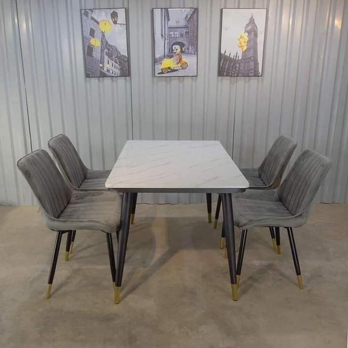 ✨Bàn ăn 1m4 chân bọc đồng, mặt đá Juno Sofa và 4 ghế bọc nệm êm