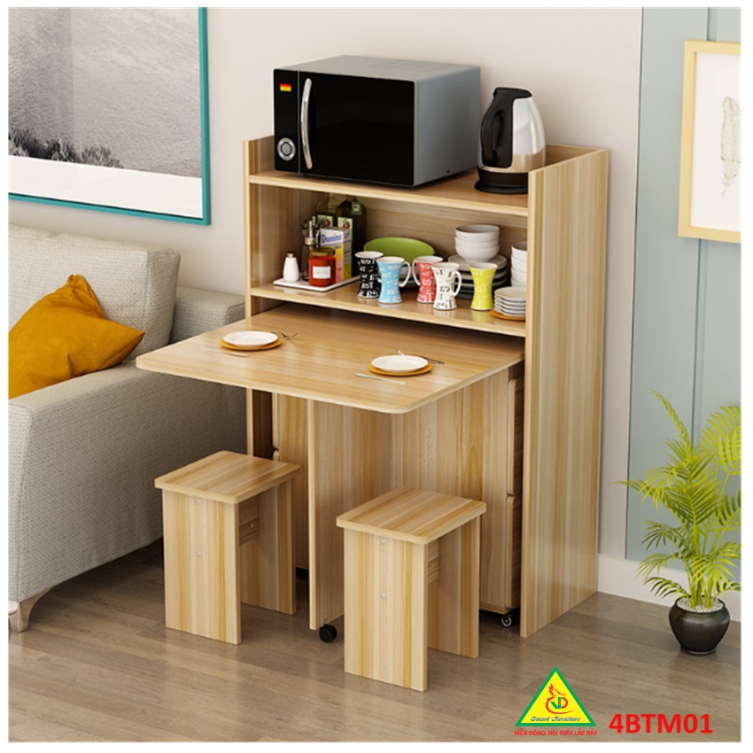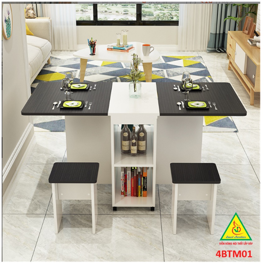 Bàn ăn gấp gọn thông minh Với các gia đình có diện tích phòng ăn không lớn lắm thì Bàn ăn gấp gọn này chính là sự lựa chọn lý tưởng nhất. Bàn ăn có kích thước nhỏ gọn, kết cấu thông minh có thể gấp gọn lại khi không sử dụng tiết kiệm diện tích. Bàn được làm bằng gỗ công nghiệp MDF cao cấp phủ melamine láng mịn, tính thẩm mỹ cao thu hút được sự chú ý của khách hàng. Tích hợp 3 in 1: Bàn, Tủ và Kệ thật Sang - Chảnh - Đẳng Cấp Dù nhà lớn hay nhỏ thì chiếc Bàn Ăn Thông Minh sẽ làm không gian gọn gàng hơn, thoáng hơn và đẹp hơn.