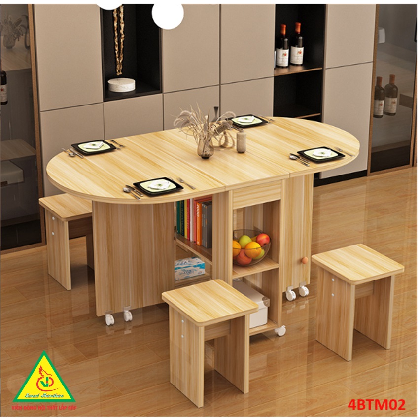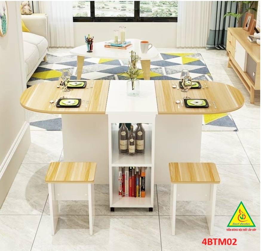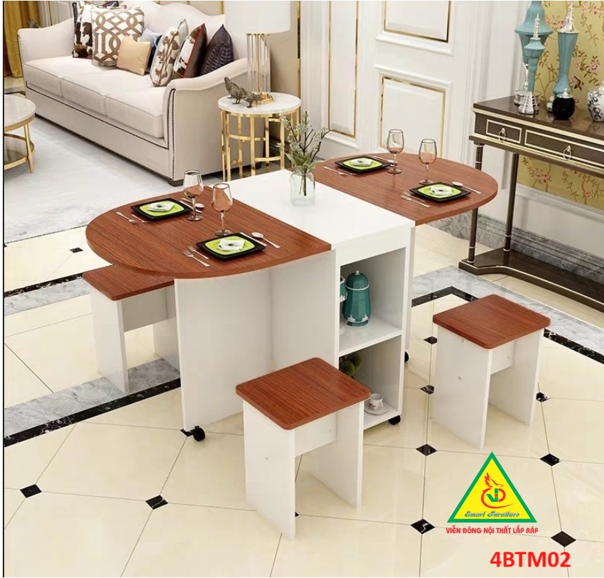 Bàn ăn gấp gọn thông minh Với các gia đình có diện tích phòng ăn không lớn lắm thì Bàn ăn gấp gọn này chính là sự lựa chọn lý tưởng nhất. Bàn ăn có kích thước nhỏ gọn, kết cấu thông minh có thể gấp gọn lại khi không sử dụng tiết kiệm diện tích. Bàn được làm bằng gỗ công nghiệp MDF cao cấp phủ melamine láng mịn, tính thẩm mỹ cao thu hút được sự chú ý của khách hàng. Tích hợp 3 in 1: Bàn, Tủ và Kệ thật Sang - Chảnh - Đẳng Cấp Dù nhà lớn hay nhỏ thì chiếc Bàn Ăn Thông Minh sẽ làm không gian gọn gàng hơn, thoáng hơn và đẹp hơn.
