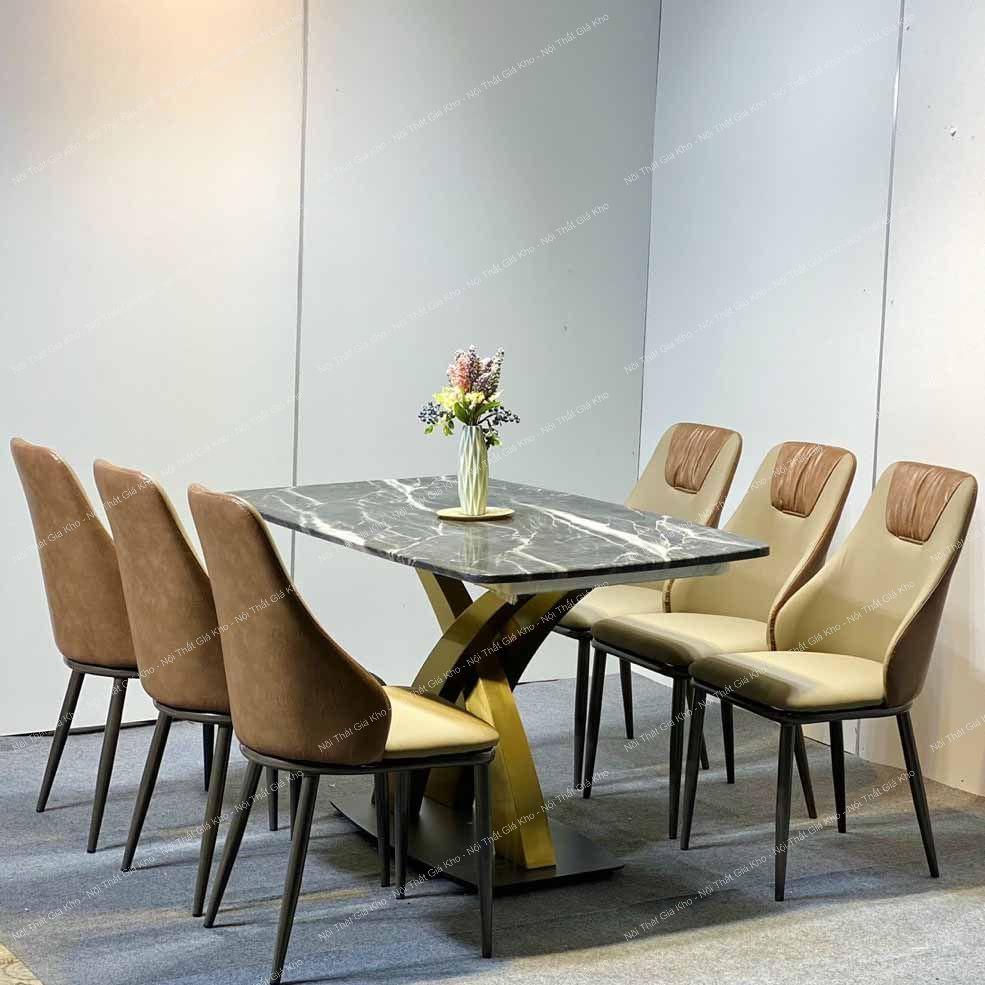 ✨Bàn ăn mặt đá Cẩm thạch nhân tạo chân chéo X cong inox mạ vàng kết hợp ghế Spot