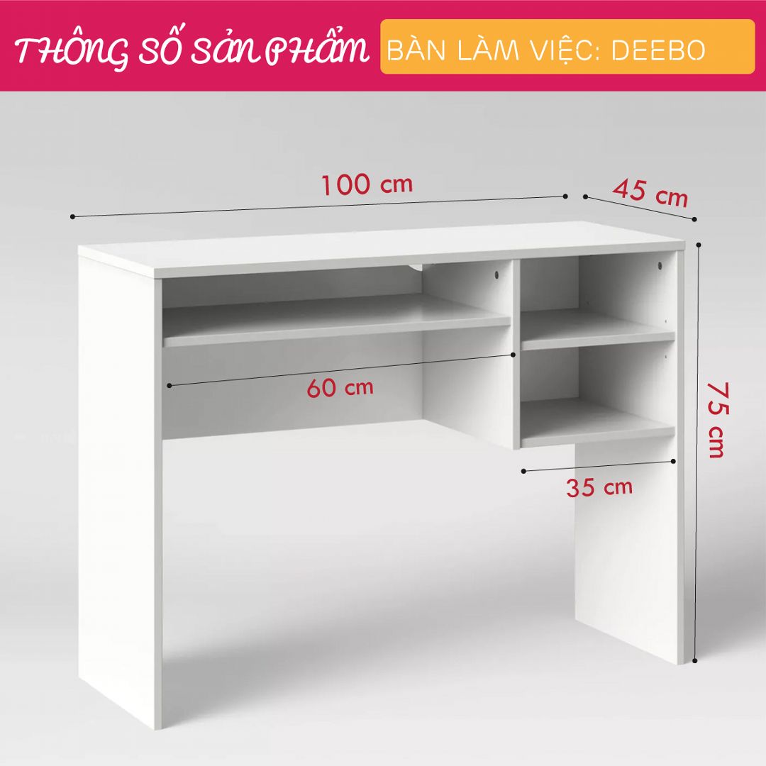 Mua tại TiktokMang đậm phong cách nội thất đơn giản, bàn làm việc gỗ SMLIFE Deebo là một sự bổ sung hoàn hảo cho phòng làm việc, phòng đọc sách của bạn. Bàn làm việc Deebo được thiết kế với nhiều tầng kệ và ngăn kéo mang đến nhiều không gian giúp bạn tổ chức sách vở và các vật dụng trang trí thoải mái. Sản phẩm là một giải pháp phù hợp cho những văn phòng hoặc căn hộ diện tích nhỏ. Sử dụng vật liệu ván ép công nghiệp MDF chống ẩm phủ Melamine cao cấp giúp bàn làm việc, bàn học gỗ SMLIFE có độ bền cao, chống trầy và chống ẩm rất tốt. Bạn có thể tự lắp đặt sản phẩm dễ dàng với các phụ kiện và hướng dẫn đi kèm. ĐẶC ĐIỂM SẢN PHẨM: