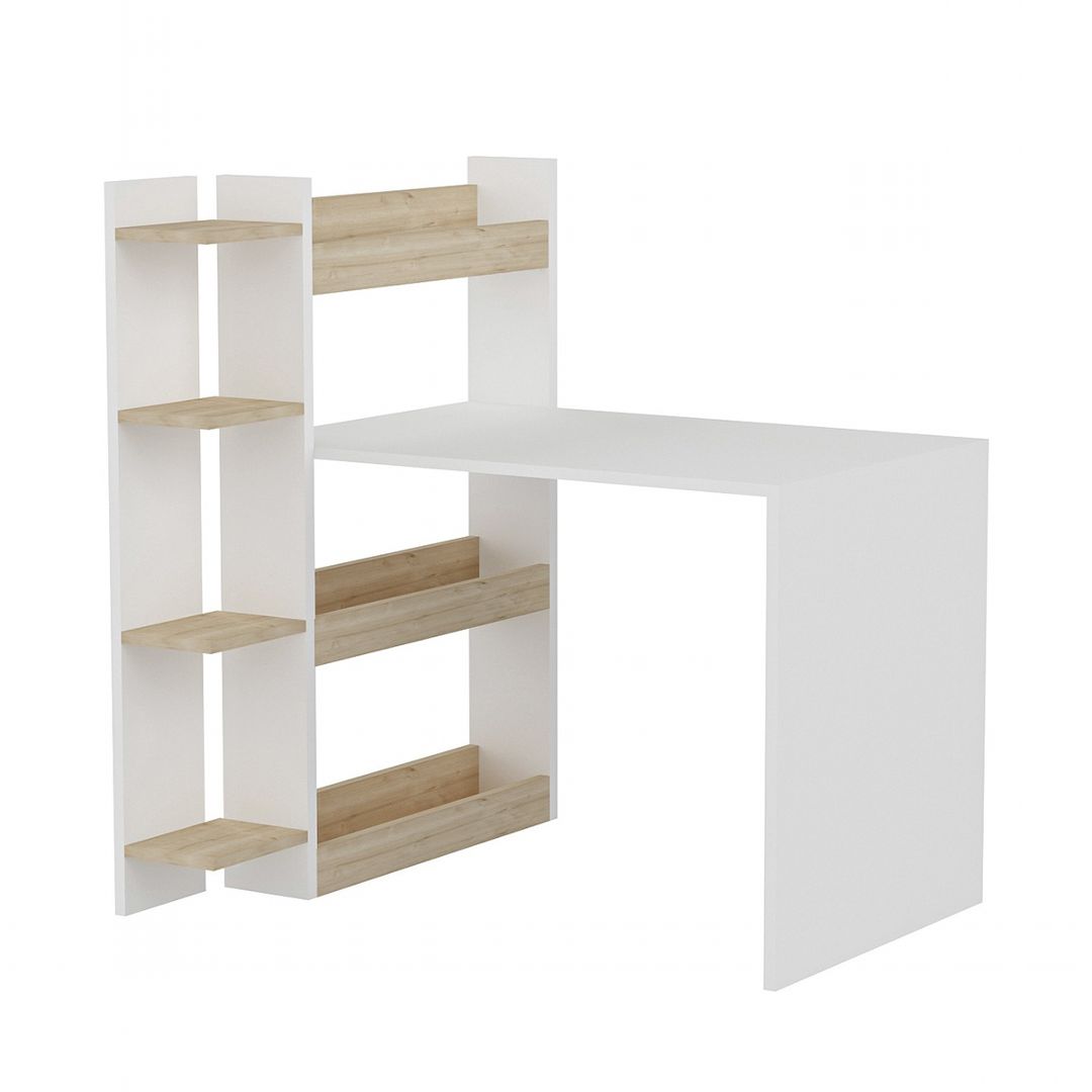 - Tên sản phẩm: Bàn làm việc IGA kèm kệ sách decor phong cách minimalism - Màu sắc: Trắng - Chất liệu: Chân thép phủ sơn tĩnh điện, mặt gỗ mdf phủ melamin chống xước