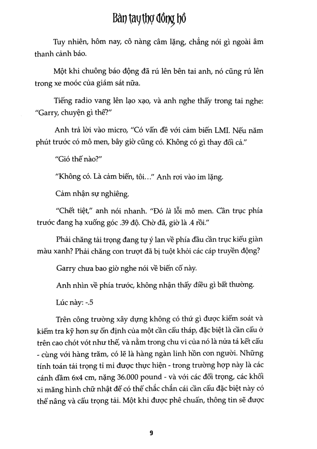 Tiểu thuyết Bàn Tay Thợ Đồng Hồ của tác giả Jeffery Deaver mở đầu bằng vụ việc, khi một cần cẩu bị sập một cách bí ẩn ở thành phố New York đông đúc náo nhiệt, gây ra tình trạng đổ nát và thương tích cho người dân vô tội. Sau vụ việc đó, một tổ chức chính trị đã đứng ra nhận trách nhiệm và loan báo trên tivi rằng sẽ gây ra một vụ sập cần cẩu thứ hai sau 24 tiếng nữa nếu chính quyền thành phố không đáp ứng cho nhu cầu của chúng.