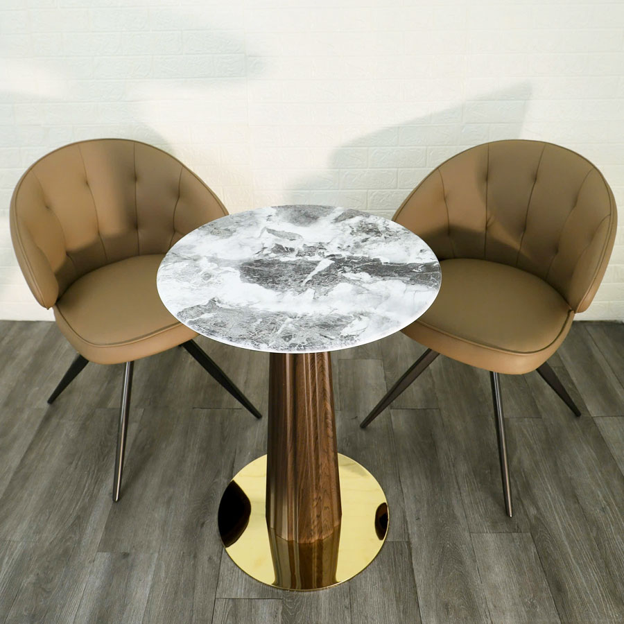 - Bàn cafe tiếp khách mặt đá nhỏ gọn - Chất liệu: Mặt đá pha lê, chân bàn sắt sơn tĩnh điện vân gỗ, đế bàn inox mạ màu vàng sang trọng - Kích thước: