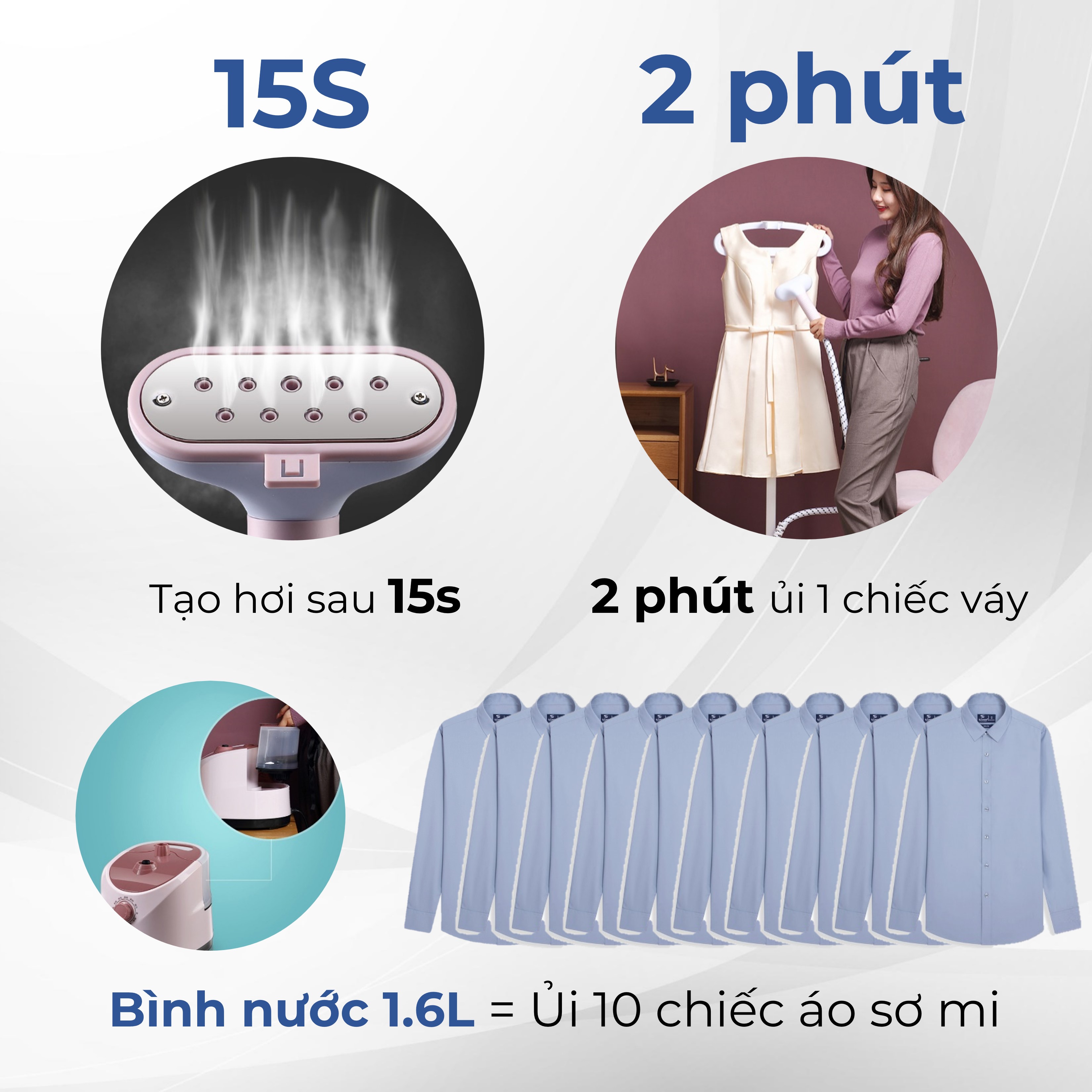 THÔNG SỐ KỸ THUẬT Dễ sử dụng An toàn cho tất cả các loại vải ủi được. Ngay cả những loại vải tinh xảo như lụa Dung tích ngăn chứa nước: 1400ml Ngăn chứa nước