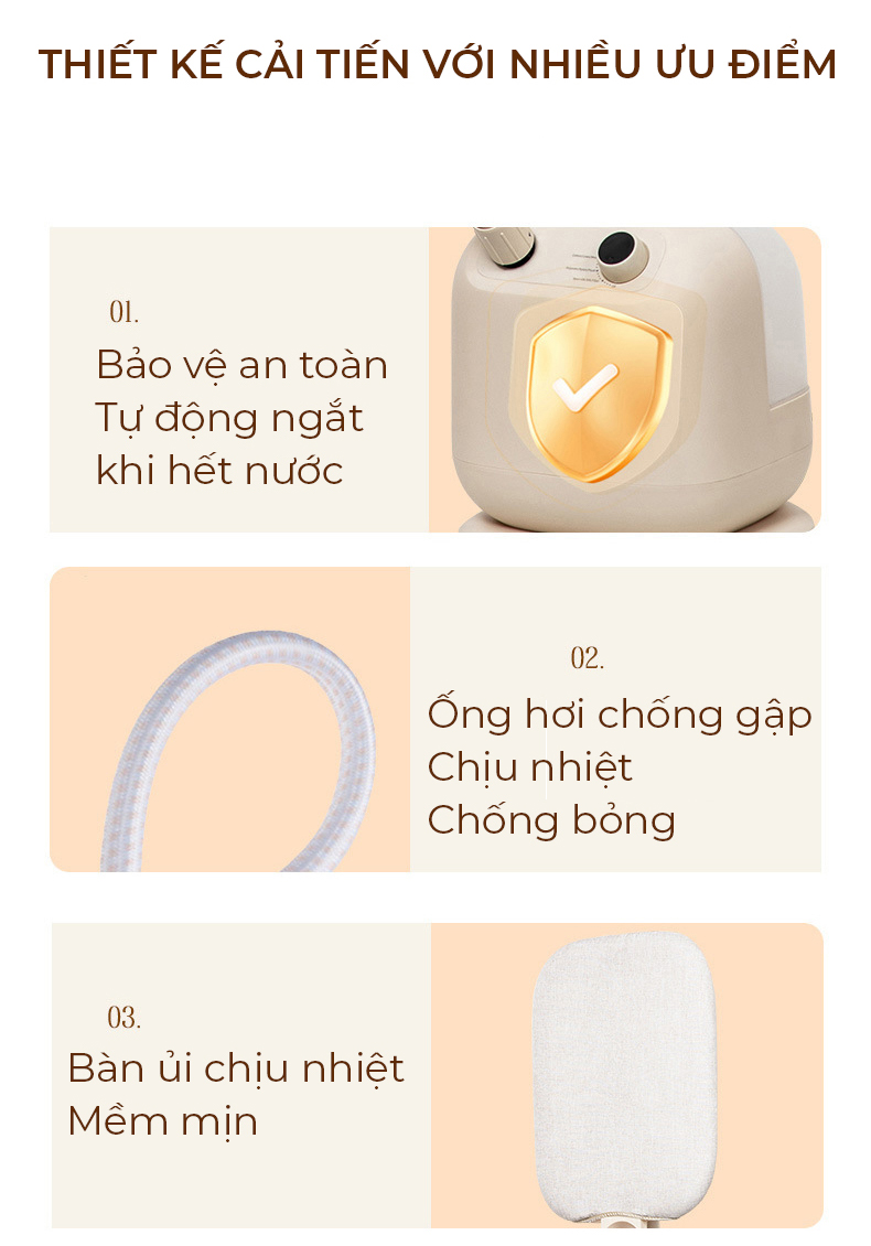 Đặc điểm nổi bật Thiết kế hiện đại, dễ dàng di chuyển và cất giữ Công suất 2000W làm nóng nhanh, tiết kiệm thời gian ủi 3 mức điều chỉnh hơi nước cùng đầu ủi nhọn
